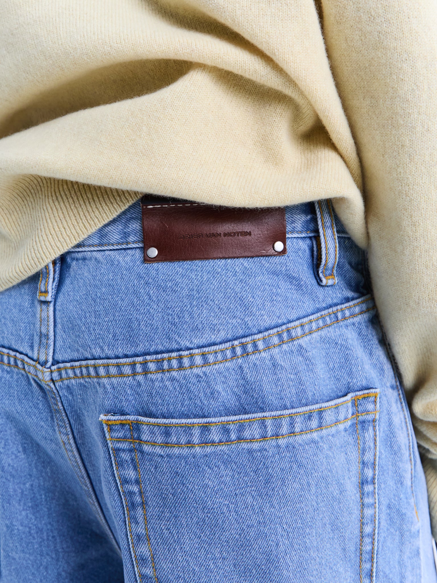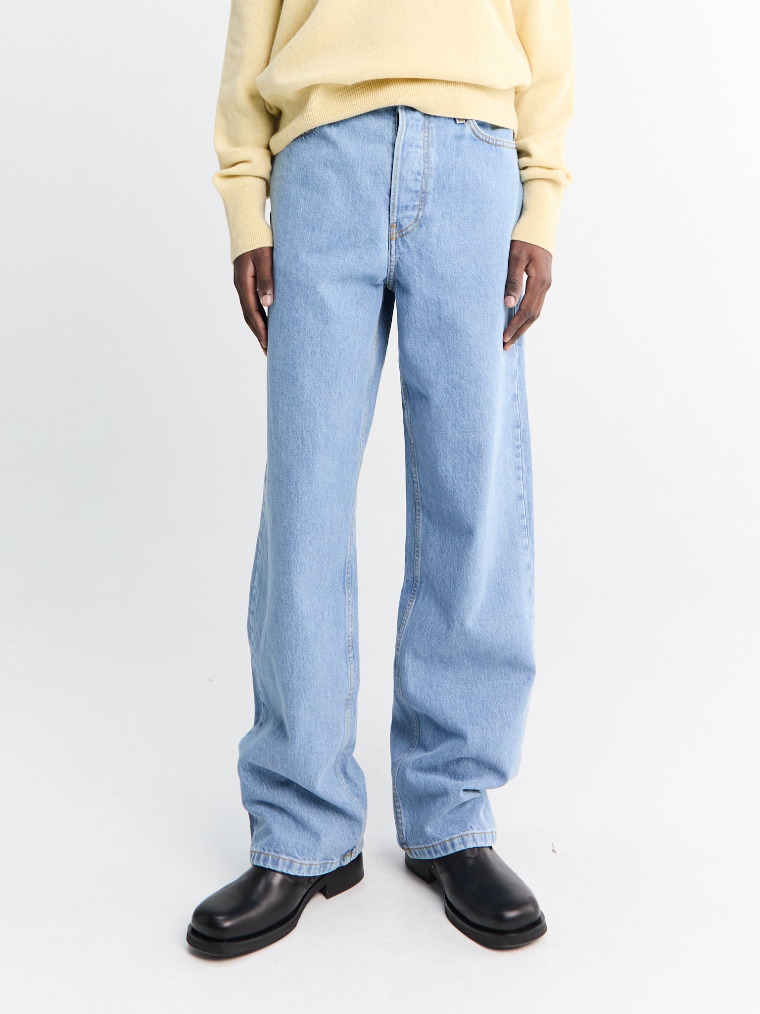 Relaxed silhouette with functional belt loops and classic five-pocket construction. Tan contrast stitching adds subtle detail to this light blue pair.