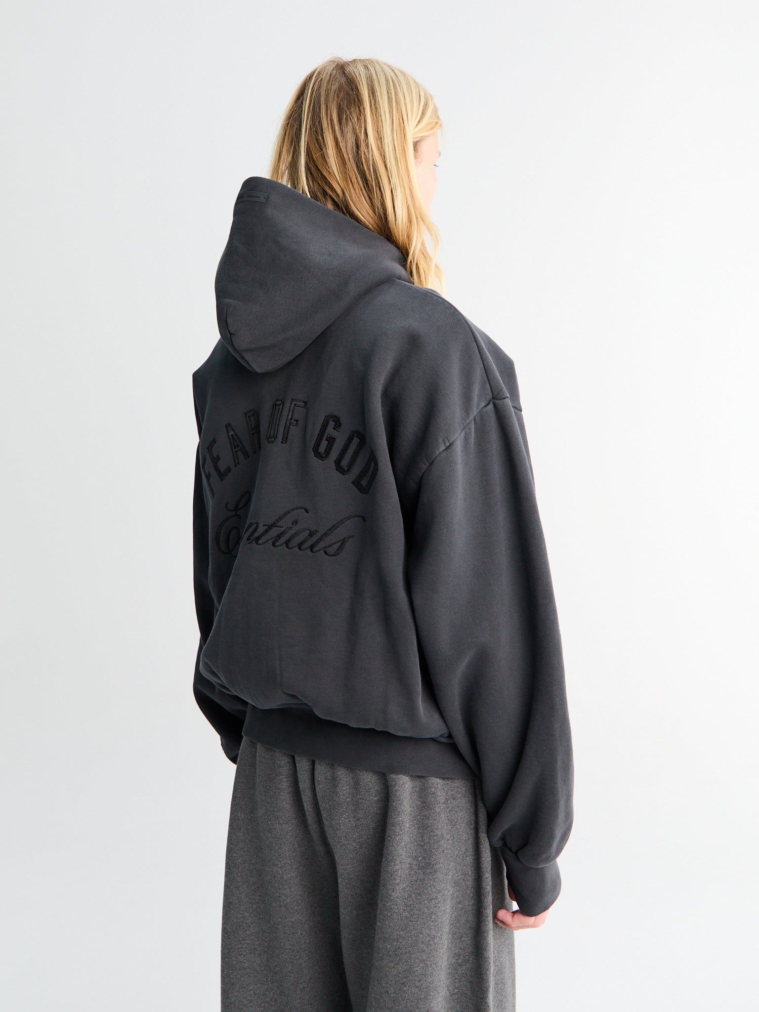 The hoodie is made from heavy 380gsm core fleece. The signature "Essentials Fear of God" soft-touch logo is branded across the back. Details include an full-zip front, double-layered hood, rib-knit cuffs, waist-hem, and rib-bound pockets