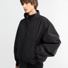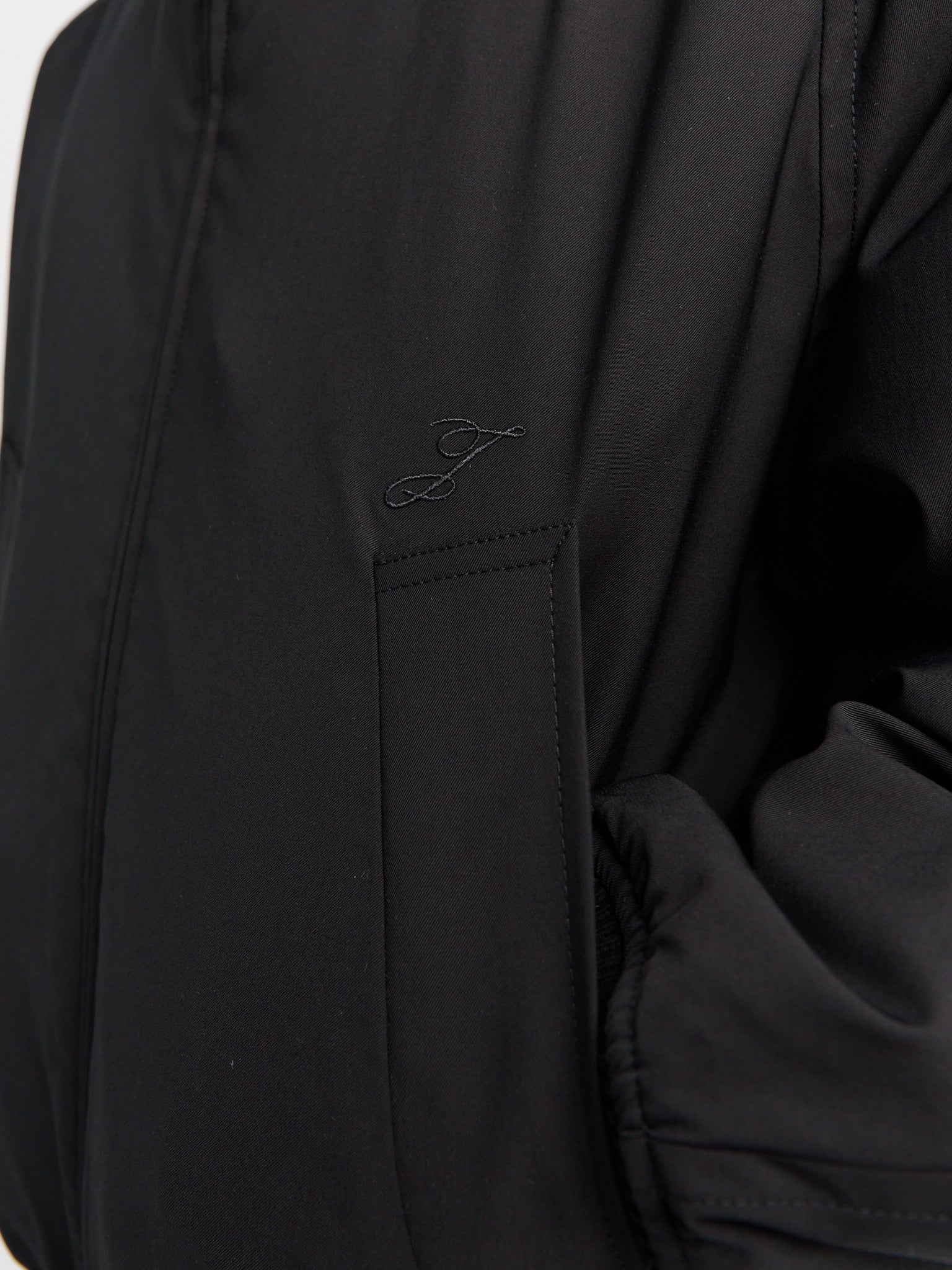 This bomber features a boxy silhouette, crafted from smooth cotton. It includes a stand-up collar, zip fastening, and ribbed cuffs and hem. Large welt pockets offer practicality, while a stitched logo is positioned on the left side. The jacket is fully padded and lined for added comfort.