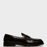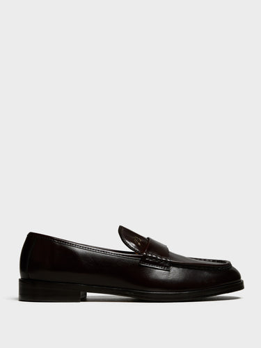 Polished brown calf leather penny loafer with a signature folded tongue and subtle silver monogram detail. Features a soft leather lining, Blake-stitched leather sole with a pre-rubberized finish. Made in Portugal from Italian leather. Dust bag included.