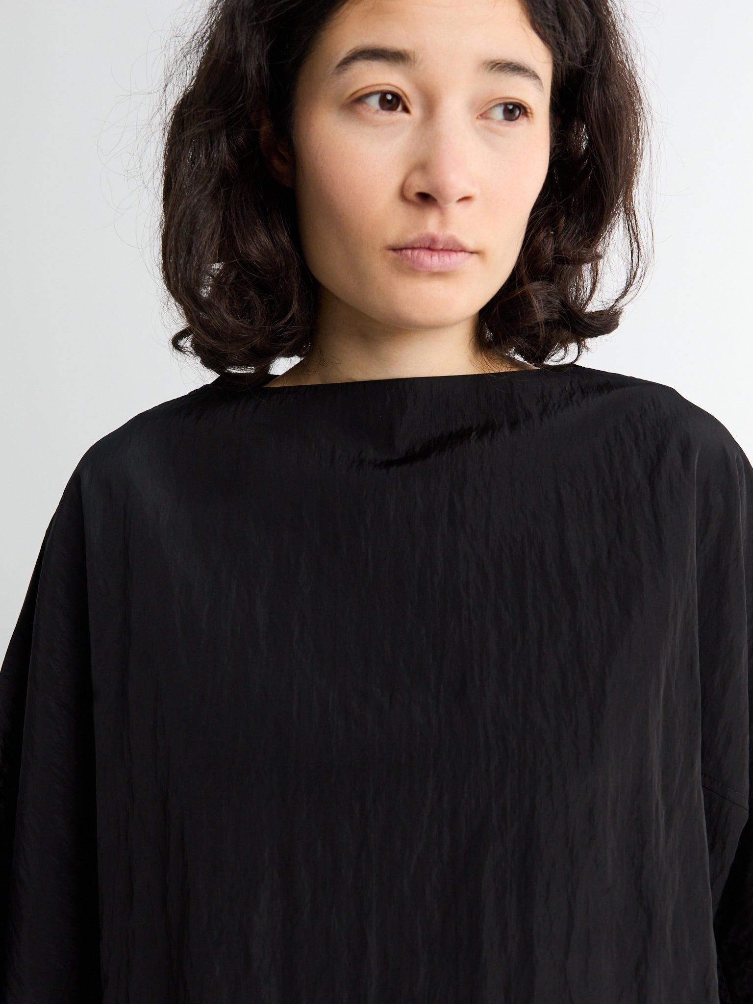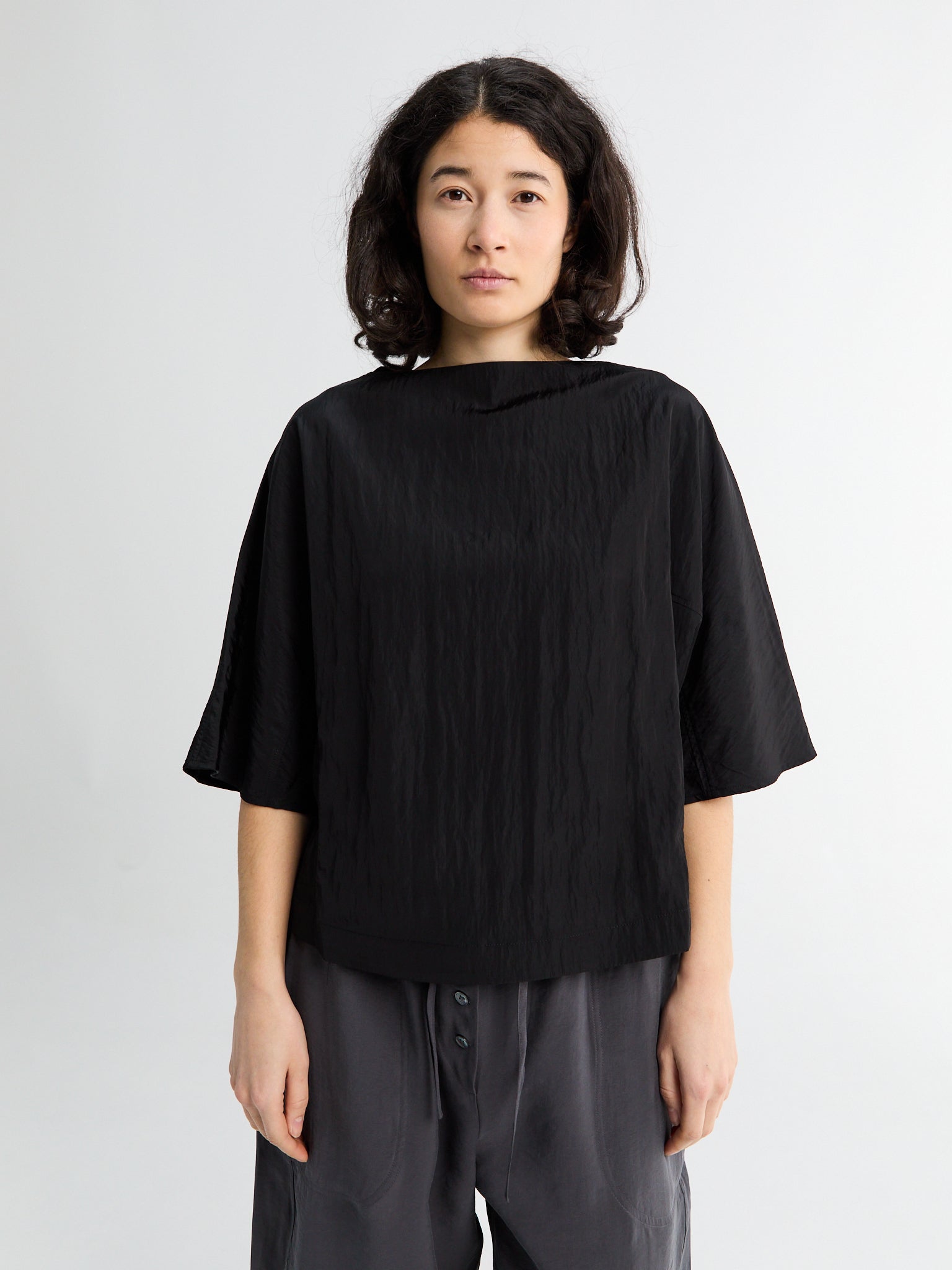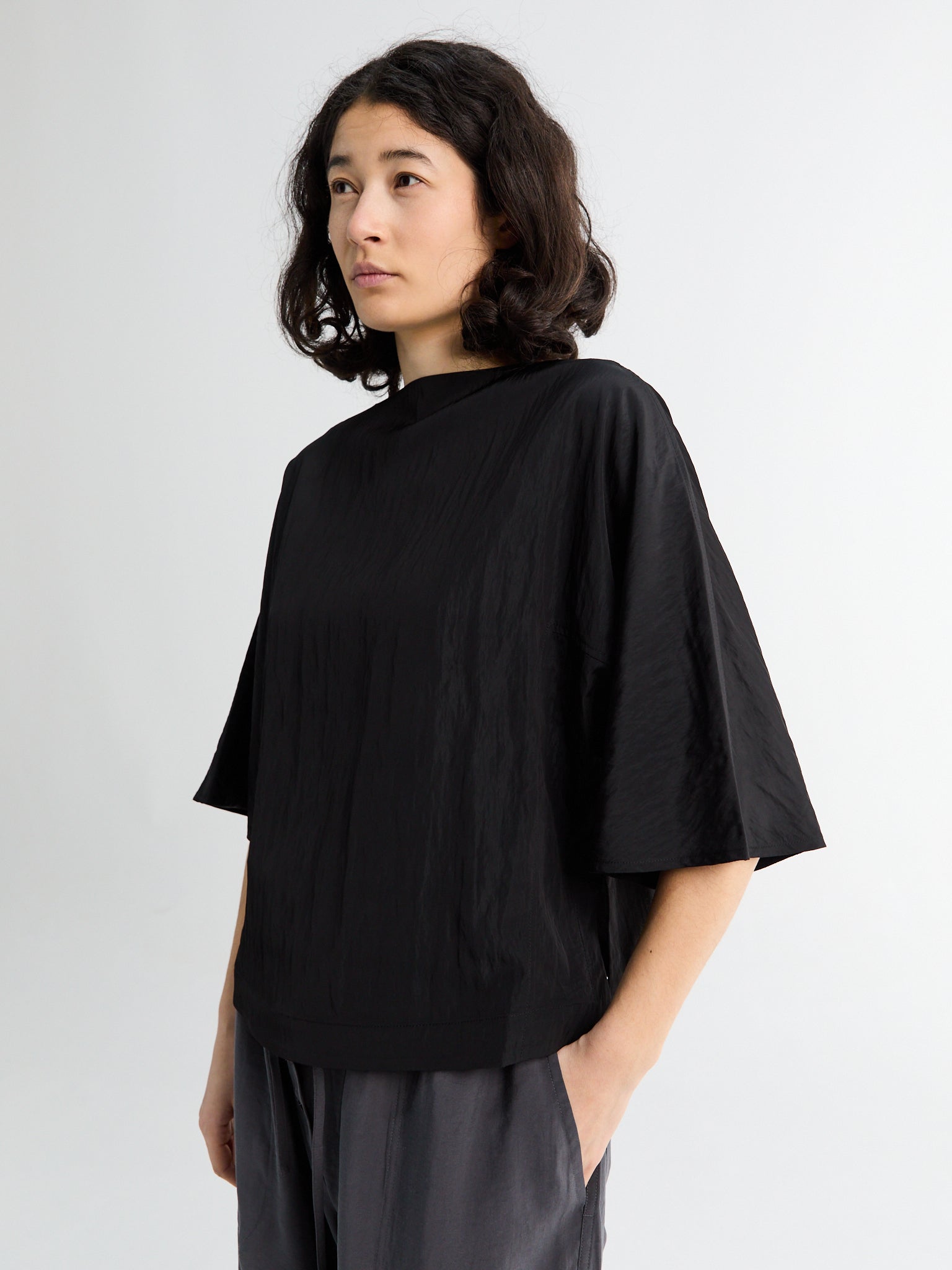 Made from a light, soft fabric, this short-sleeve top has fine vertical pleats all over. It has a relaxed fit, a simple round neckline, and slightly flared sleeves, giving it a nice shape and an elegant flow.