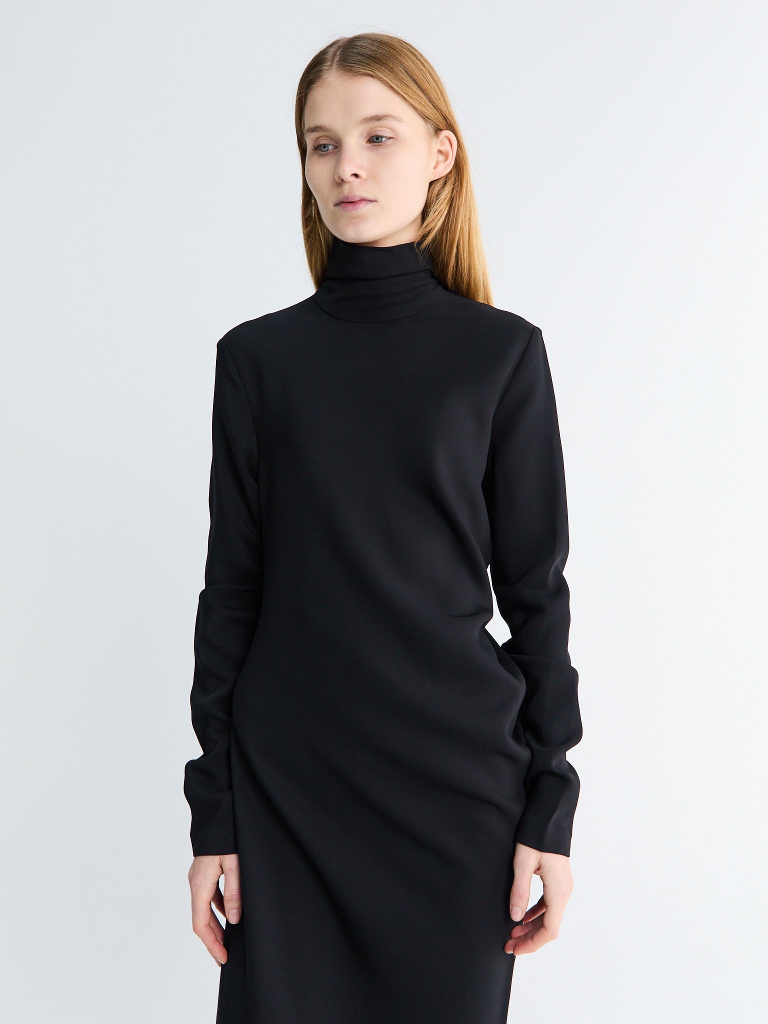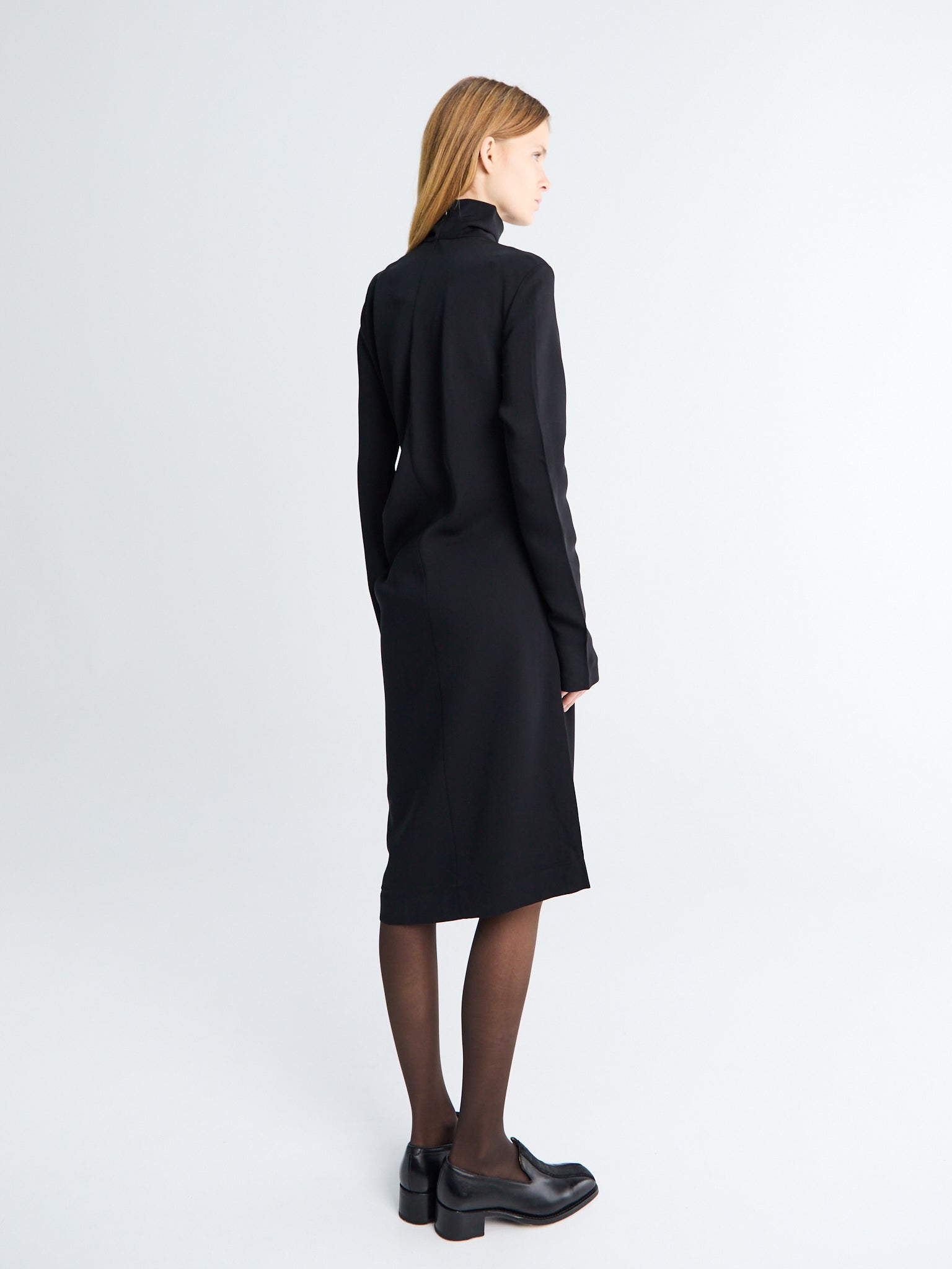 A striking black dress featuring an inventive twisted design that creates dynamic movement and shape. The high neckline and extended sleeves offer elegant coverage, while the relaxed fit allows for comfortable wear throughout the day. A hidden back zipper ensures a seamless finish.