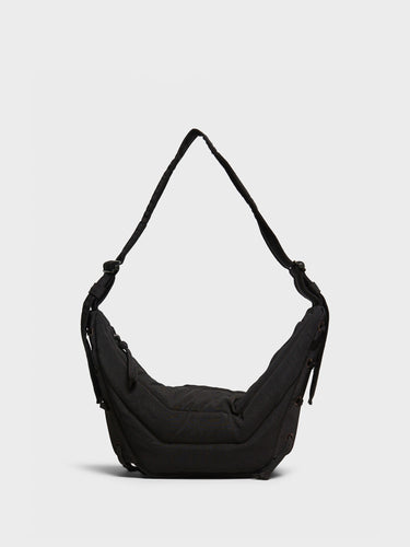 This versatile unisex bag is a member of the Soft Game collection. The Small Soft Game is crafted from a soft, slightly textured nylon canvas with a water-resistant coating and GRS certification. Its quilted fabric offers a matte look and a durable design that retains its shape over time. Drawing influence from the Croissant bag, it balances lightweight construction with practicality, featuring a cushioned, adjustable strap and a secure interior zip pocket. It provides ample room for small essentials like a smartphone or a compact book. Adjustable laces and embroidered eyelets on each side let you modify the bag's capacity. Perfect for everyday wear, it can be styled as a crossbody or shoulder bag to suit your needs.