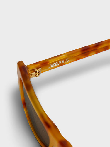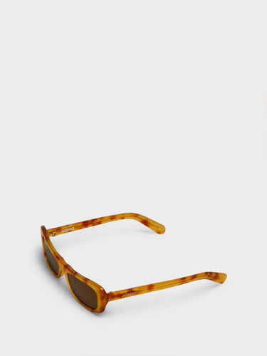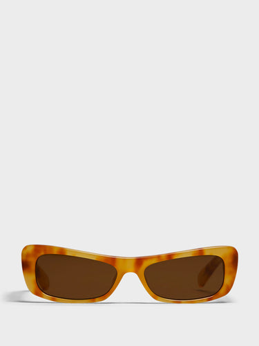 Jacquemus Capri Sunglasses in Beige T-Shell feature a sleek rectangular cat-eye frame crafted from glossy acetate. Designed with warm brown lenses and finished with gold logo detailing at the temples. Provide UV 400 protection for everyday wear.