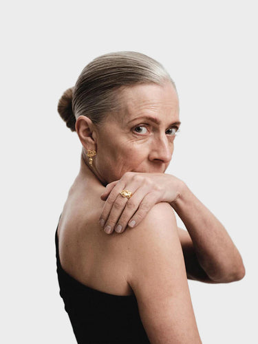 The Michelle ring is a statement piece crafted in gold-plated sterling silver. It features a chunky front and an organic shape that contrasts with its textured surface.