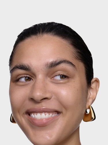This earring is designed in Denmark and made from recycled sterling silver. It features a soft geometric trapeze shape with flat sides and a hollow interior for light, comfortable wear. Nickel-free, hypoallergenic, and finished with a unique rubber lock for a seamless look.