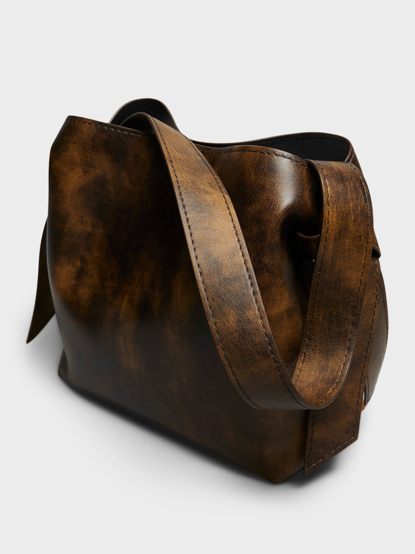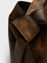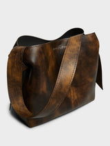 This ochre yellow Musubi shoulder bag features distinctive musubi knots on either side. Constructed from supple leather with intentional aging treatment, it combines refined craftsmanship with understated elegance. The design includes an adjustable shoulder strap for versatile carrying, an interior zip pocket with branded lanyard detail, and the signature embossed Acne Studios logo. A secure snap button closure completes the piece.