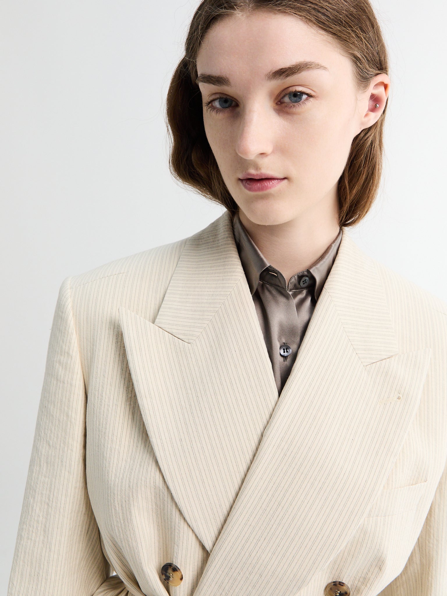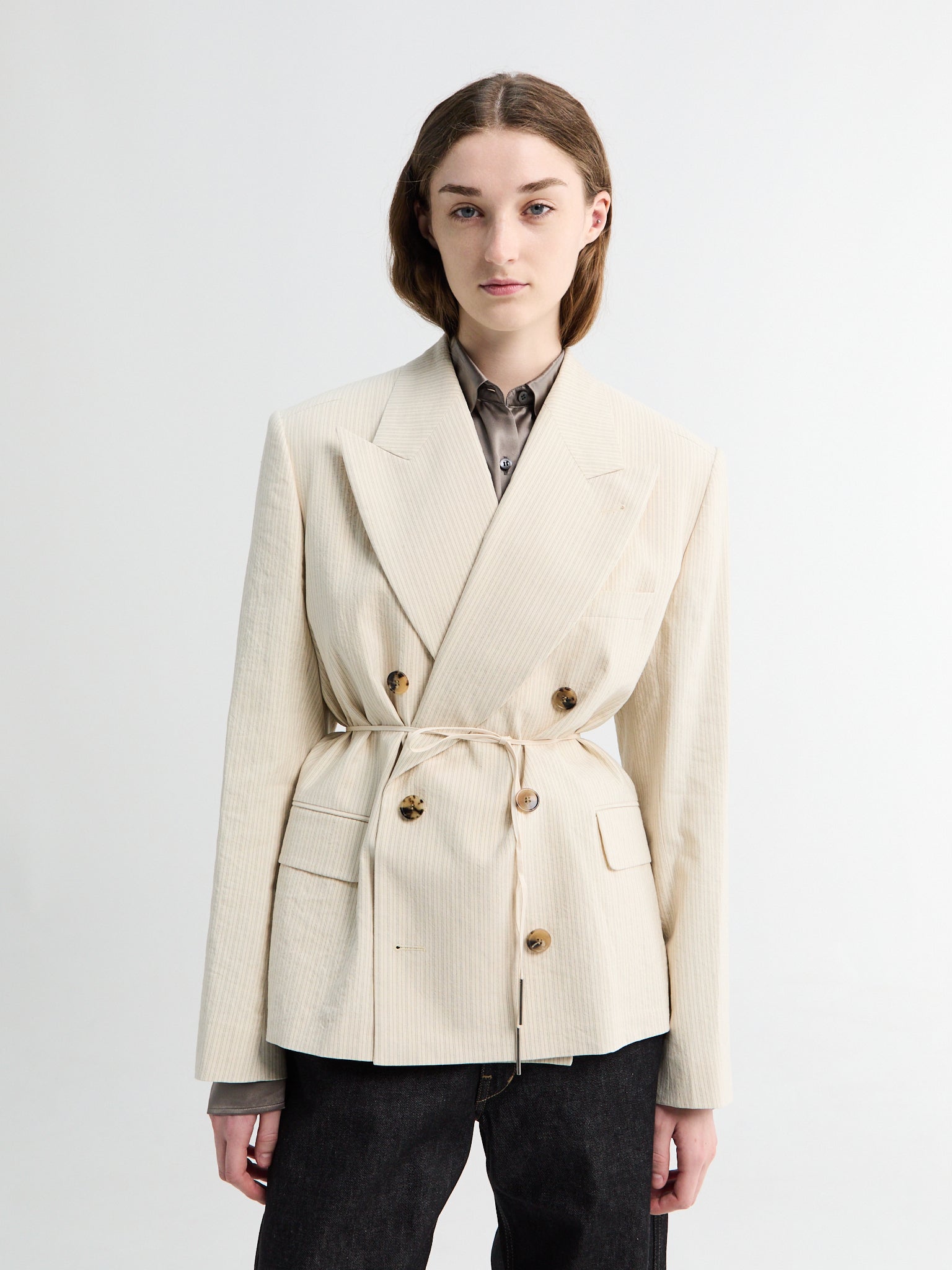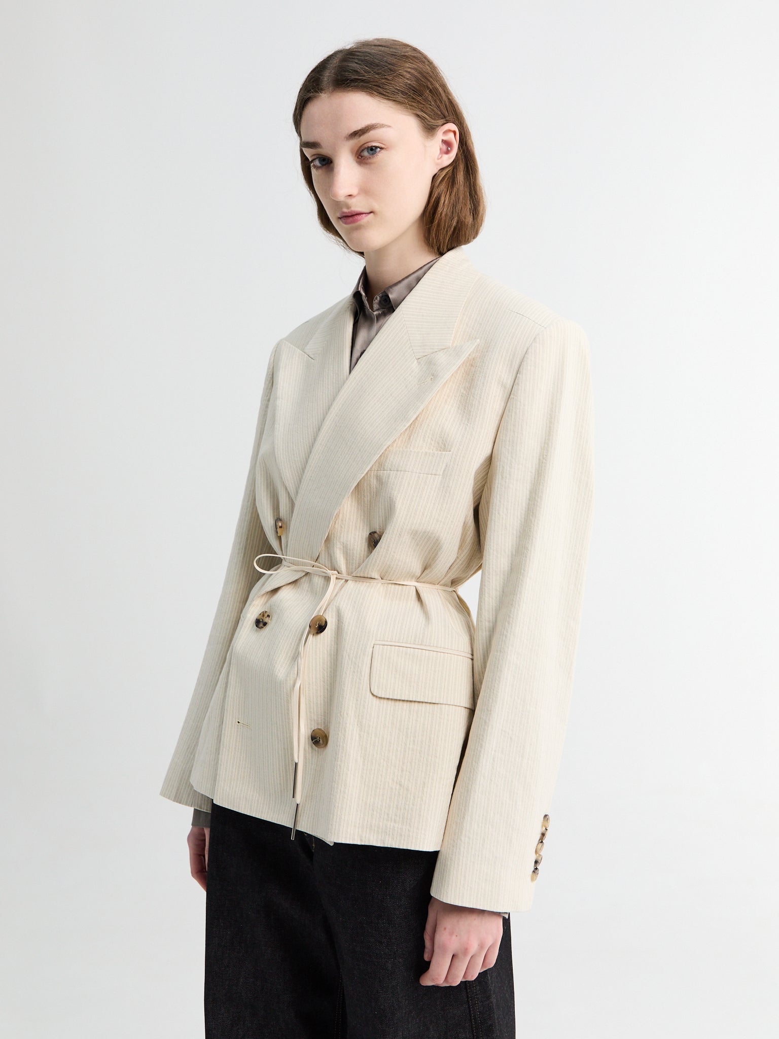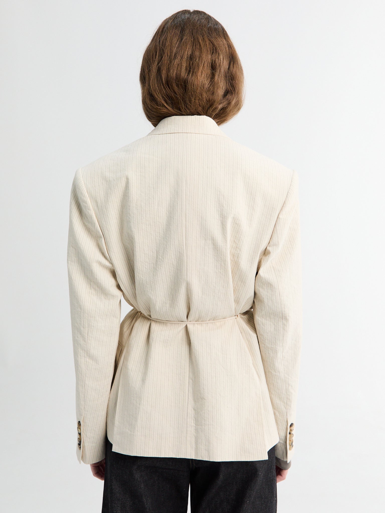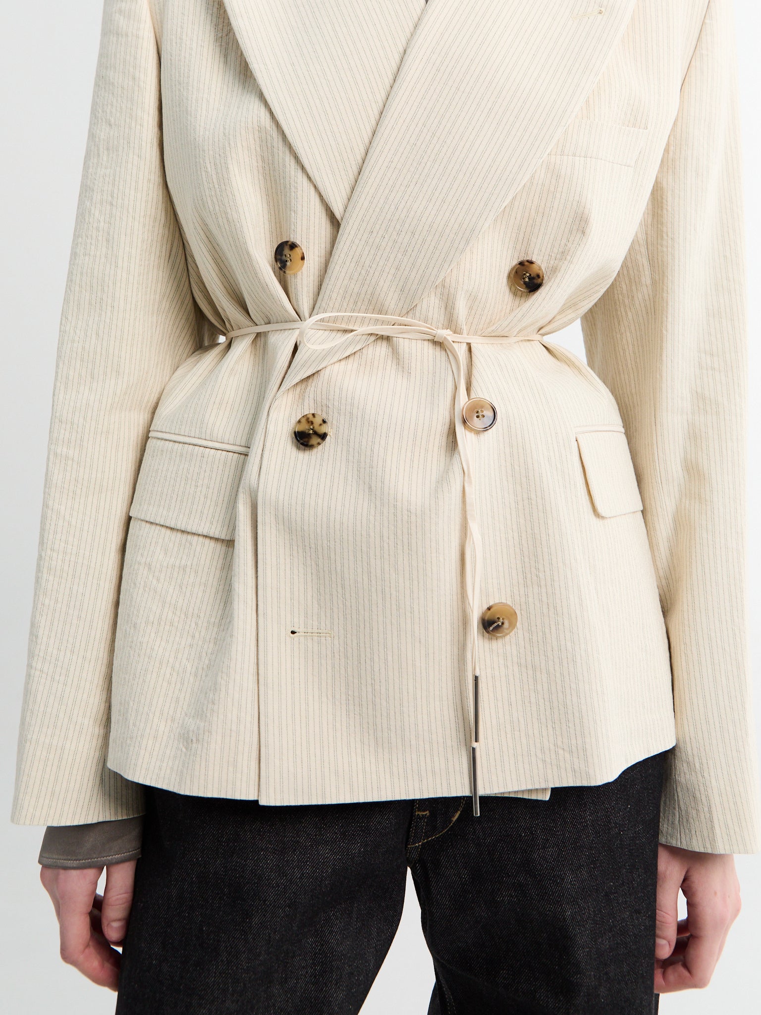 Structured ecru blazer with subtle pinstripe weave and relaxed double breasted cut. Patch pockets, and an integrated self-tie belt for effortless waist definition.