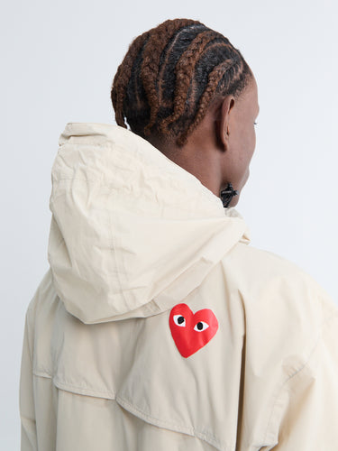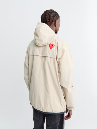 CDG x K-Way Le Vrai 3.0 Leon Jacket in Beige. Made with waterproof, windproof, and breathable ripstop fabric, this regular fit jacket also features a packable design, adjustable hood, and water-resistant seams.