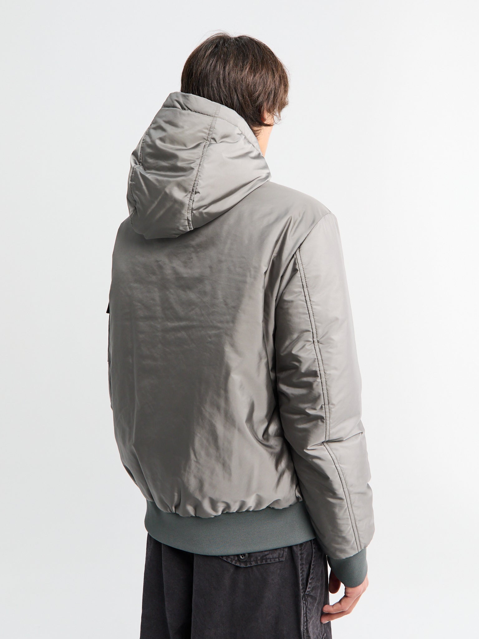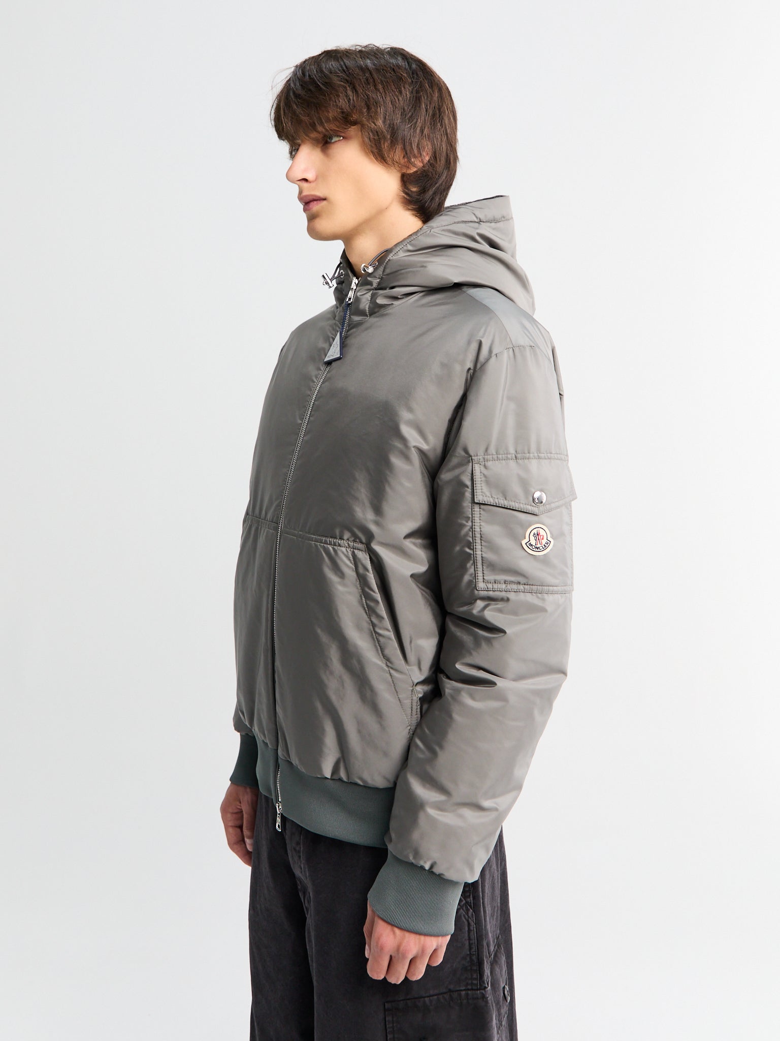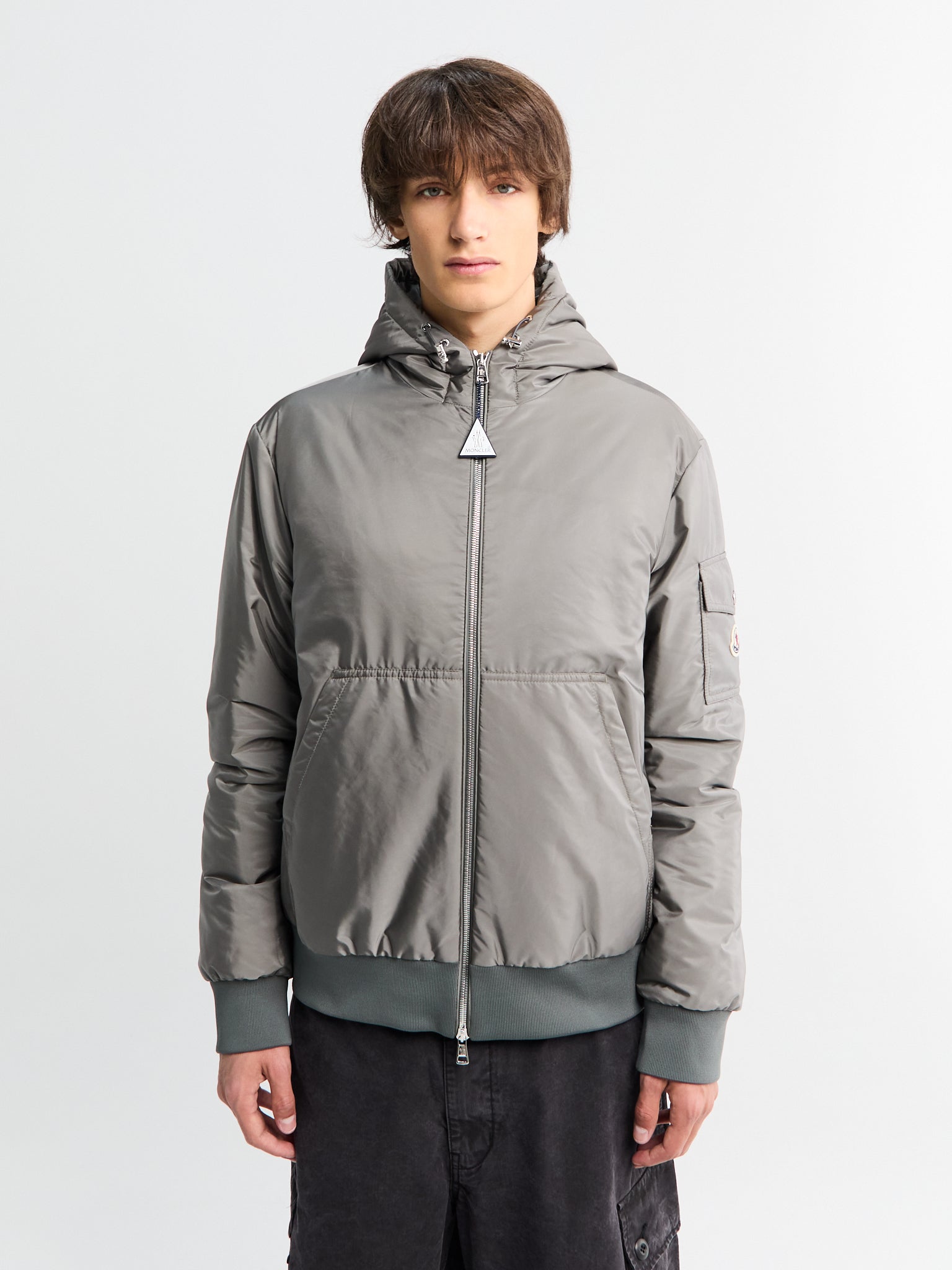 Made with water-repellent nylon fabric, this short down jacket features a down filling and an adjustable hood lined with nylon. It offers a regular fit with tailored shoulders and chest, a zip closure, kangaroo pockets, and a sleeve pocket secured by a snap button. The jacket is finished with ribbed cuffs and hem for added comfort.