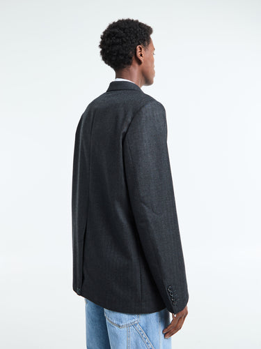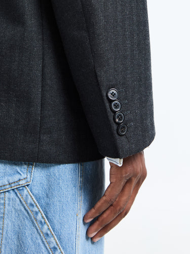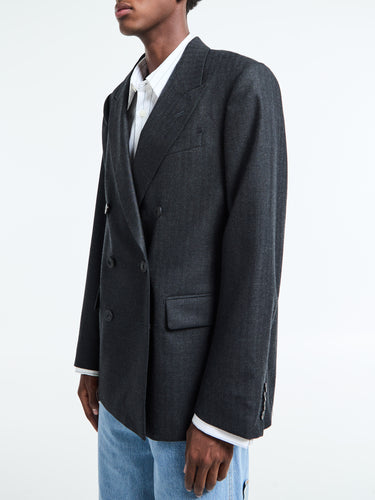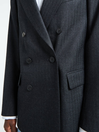 The Buforden Jacket in Dark Grey from Dries Van Noten is a blazer crafted from 100% wool. Featuring a tailored fit with a notched lapel collar and structured shoulders, this jacket includes flap pockets and a double-breasted front.