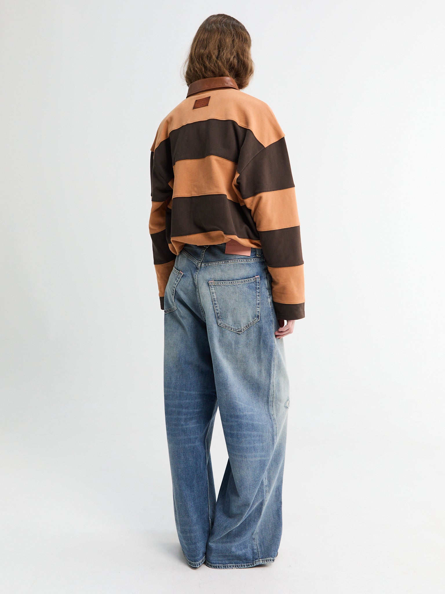 Lightweight denim jeans with a soft mid-blue wash and hand distressed seams for authentic character. Features a loose fit, low waist, super baggy leg, and button-fly closure for effortless style.