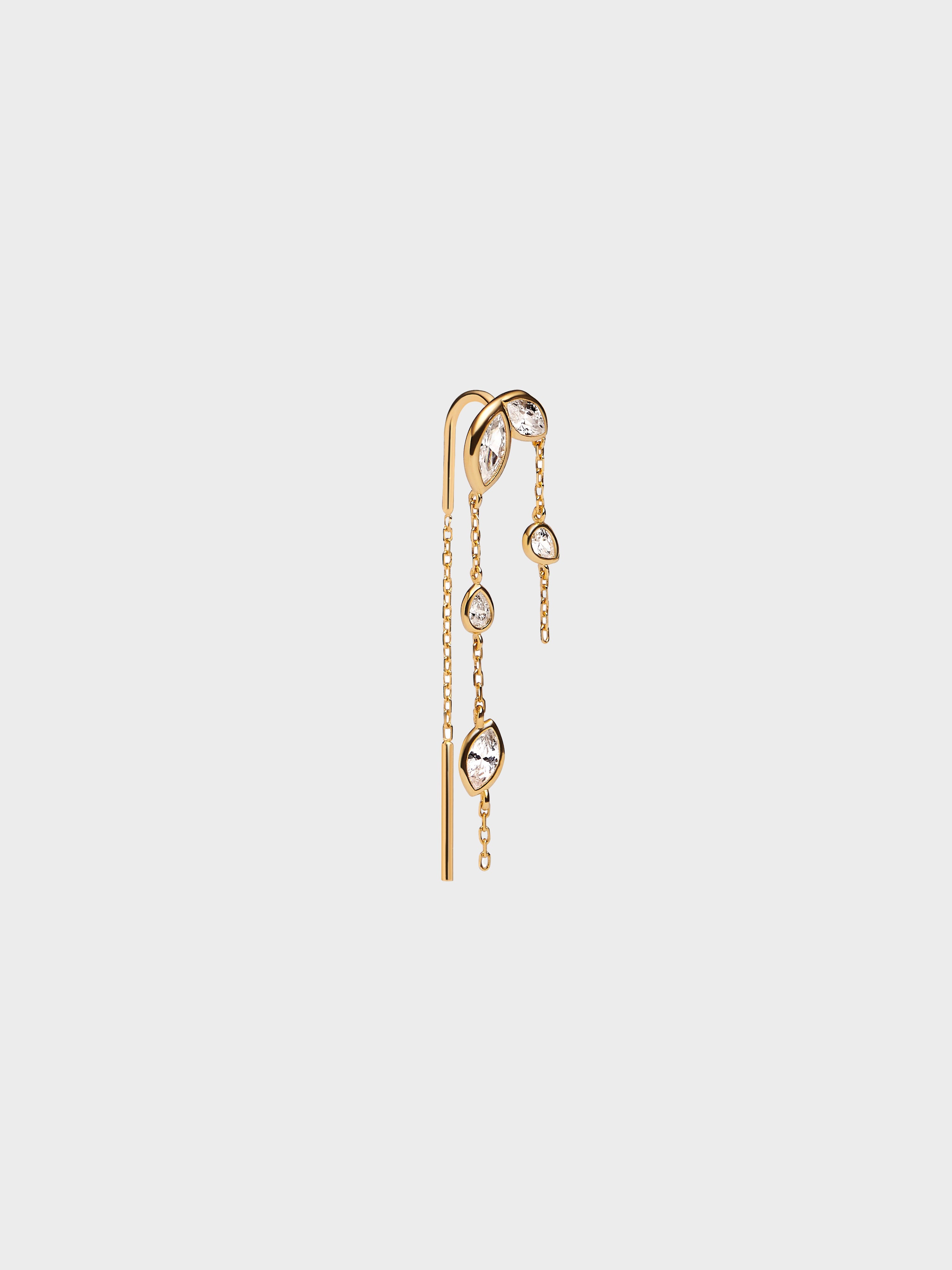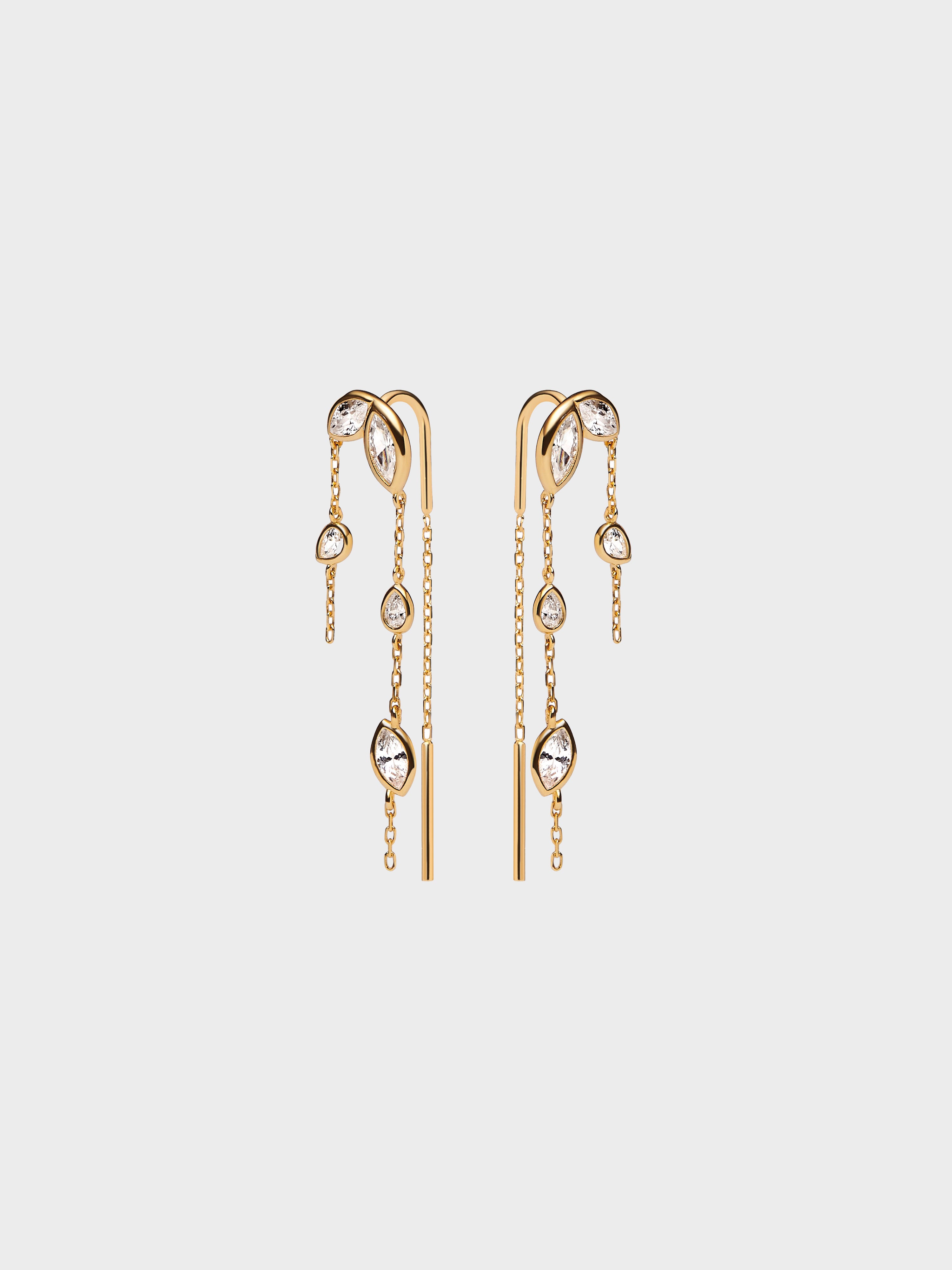 These Swift Earrings 03 feature a refined silhouette with marquise- and pear-cut zirconia stones set along a delicate chain. Finished in polished gold, they offer subtle sparkle and effortless elegance.