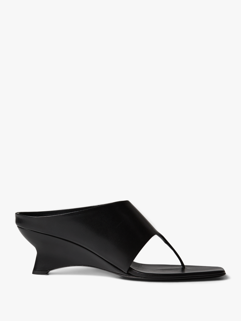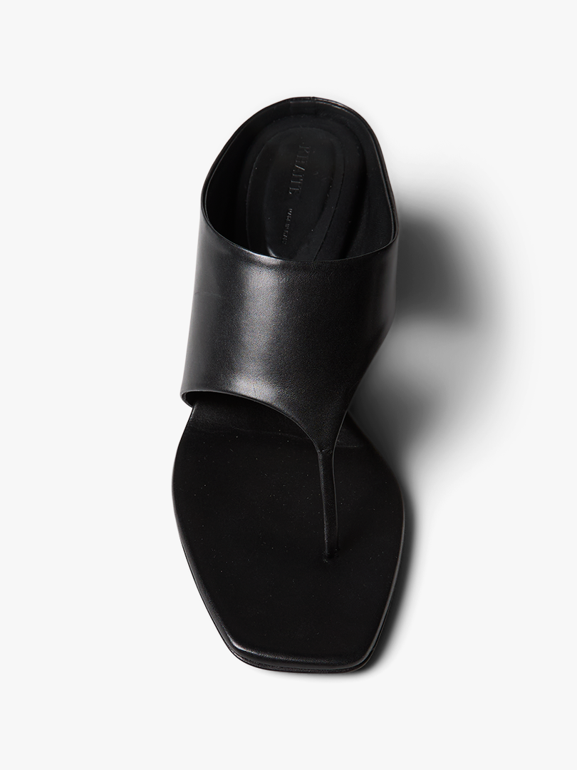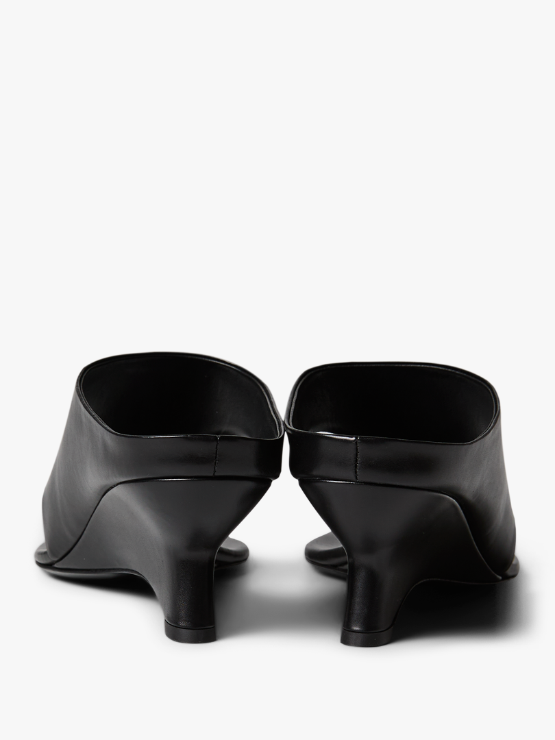 Crafted from smooth black leather, the Marlow Mule presents a modern, sculptural form. This slip-on style is defined by a clean, open-toed upper and a distinctive architectural block heel.