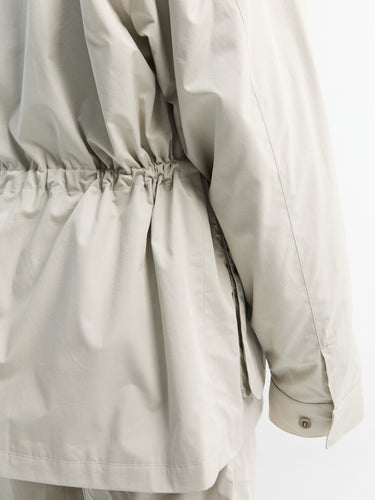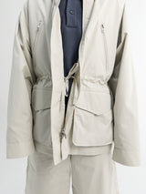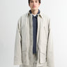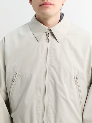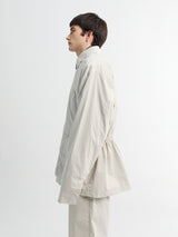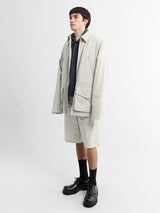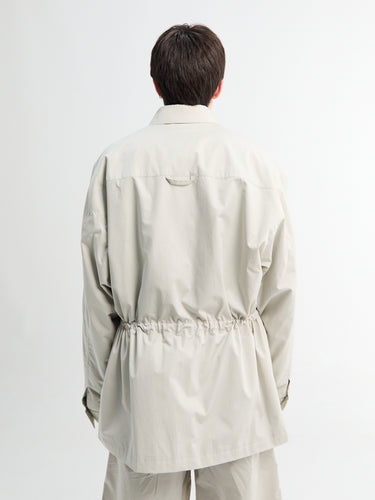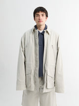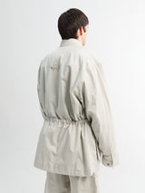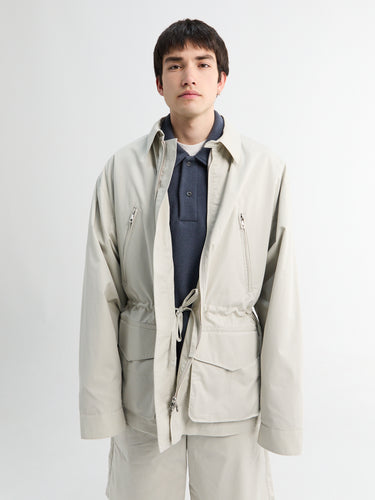 The Rier field jacket offers a tailored reinterpretation of a utilitarian silhouette. Crafted from light grey suiting fabric for a more structured drape, this relaxed-fit design features a covered placket and functional patch pockets.