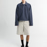 100% natural wool fleece polo in ardoise. Biodegradable and crafted in Austria, this polo features a cropped bodice, long sleeves, and mother of pearl buttons. The wool pile requires fewer washes and regulates body temperature, making it suitable for hiking, leisure, and travel.