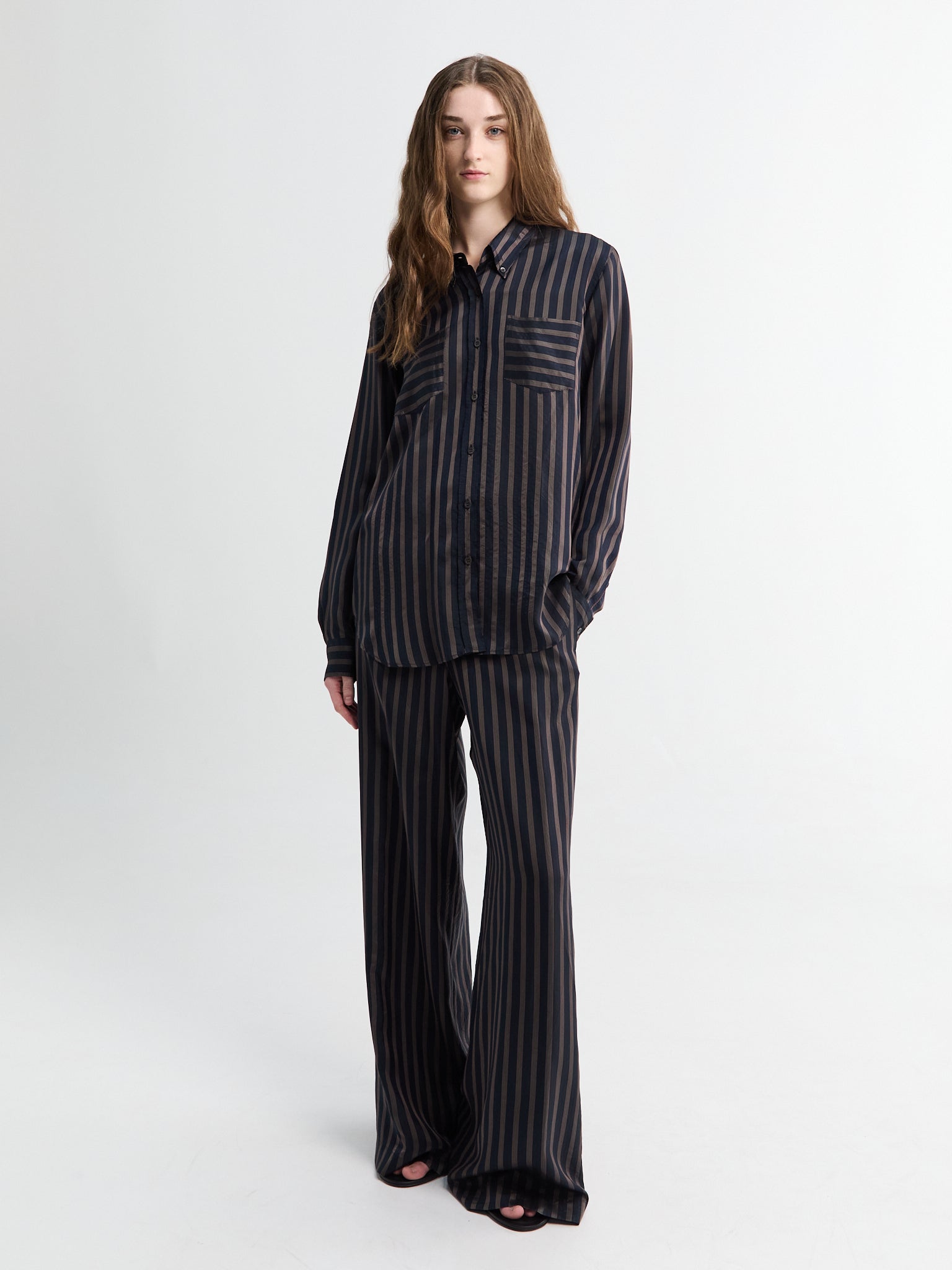 The Cheers Shirt in deep navy is cut from a fluid, lightweight material for a relaxed silhouette that drapes softly. It is detailed with a point collar and single-button cuffs.
