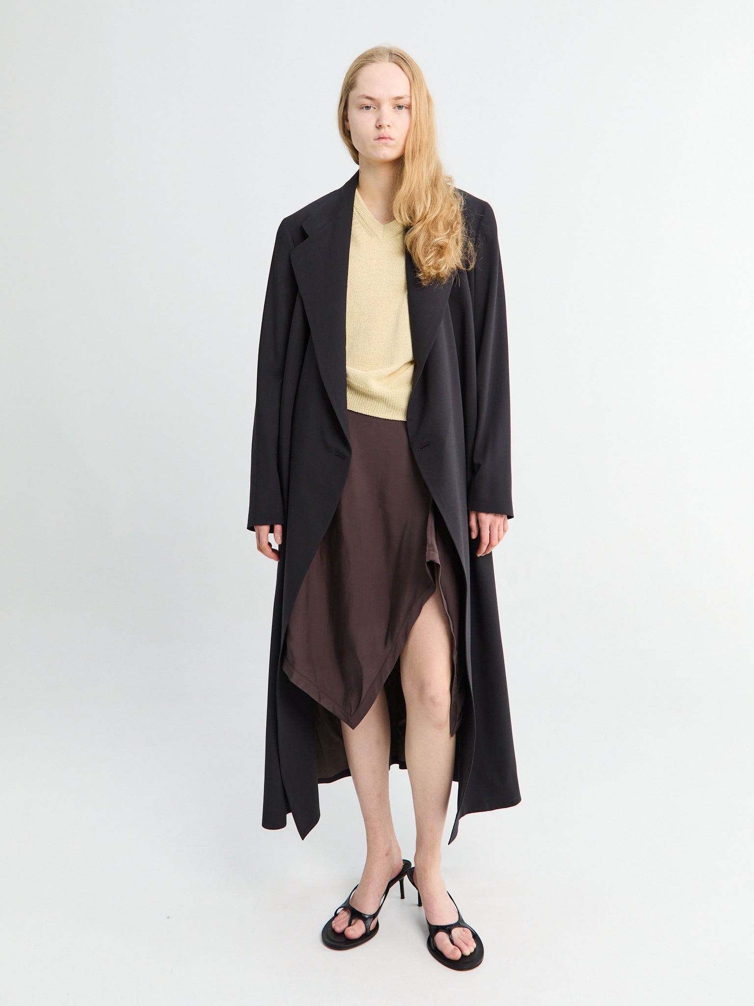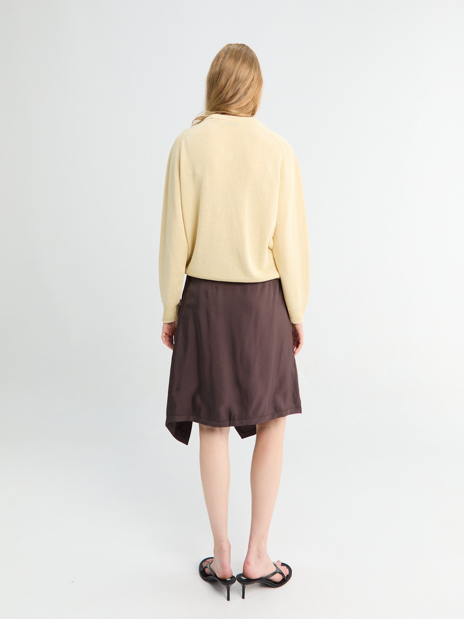 Cut from a glossy foulard fabric with a deliberately creased texture, this skirt features a draped construction that forms a fluid, asymmetric silhouette. The design falls below the knee and is engineered for ease of movement.