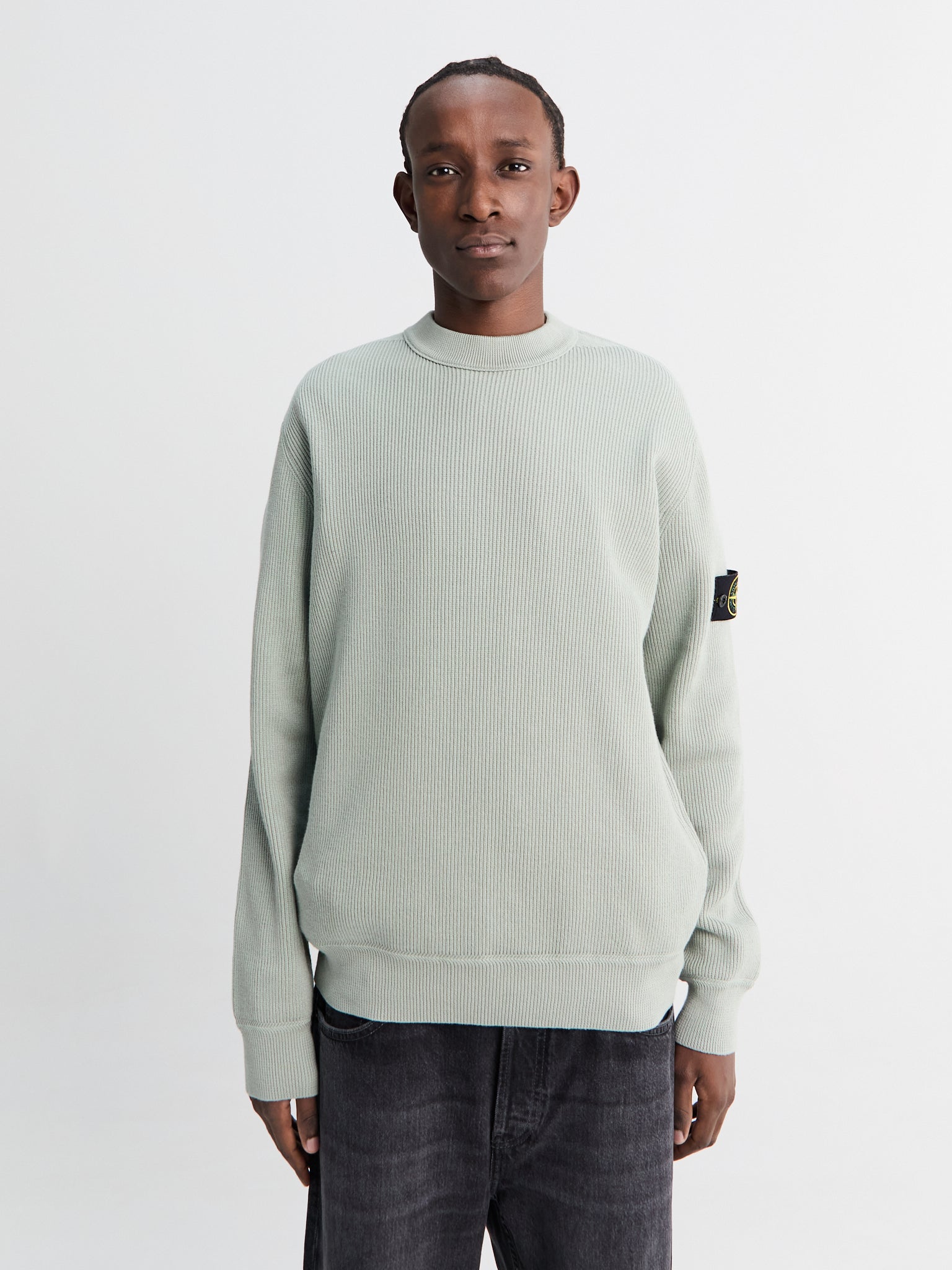 Pure wool crewneck with textured waffle knit and raglan sleeves. Simple, durable construction in a sage tone.