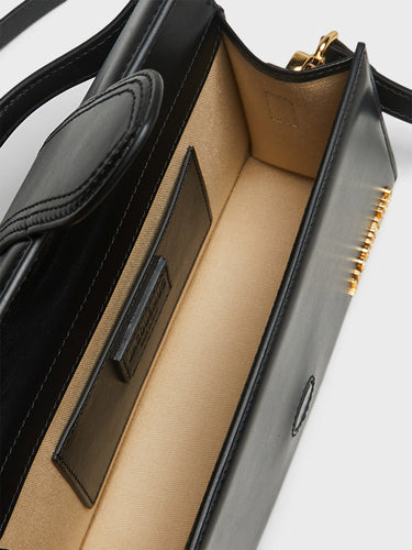 The Le Grand Bambino Bag in Black from Jacquemus features an adjustable crossbody strap, a small handle, and a card slot rear pocket. It is complete with a flap magnet closure and golden JACQUEMUS logo.