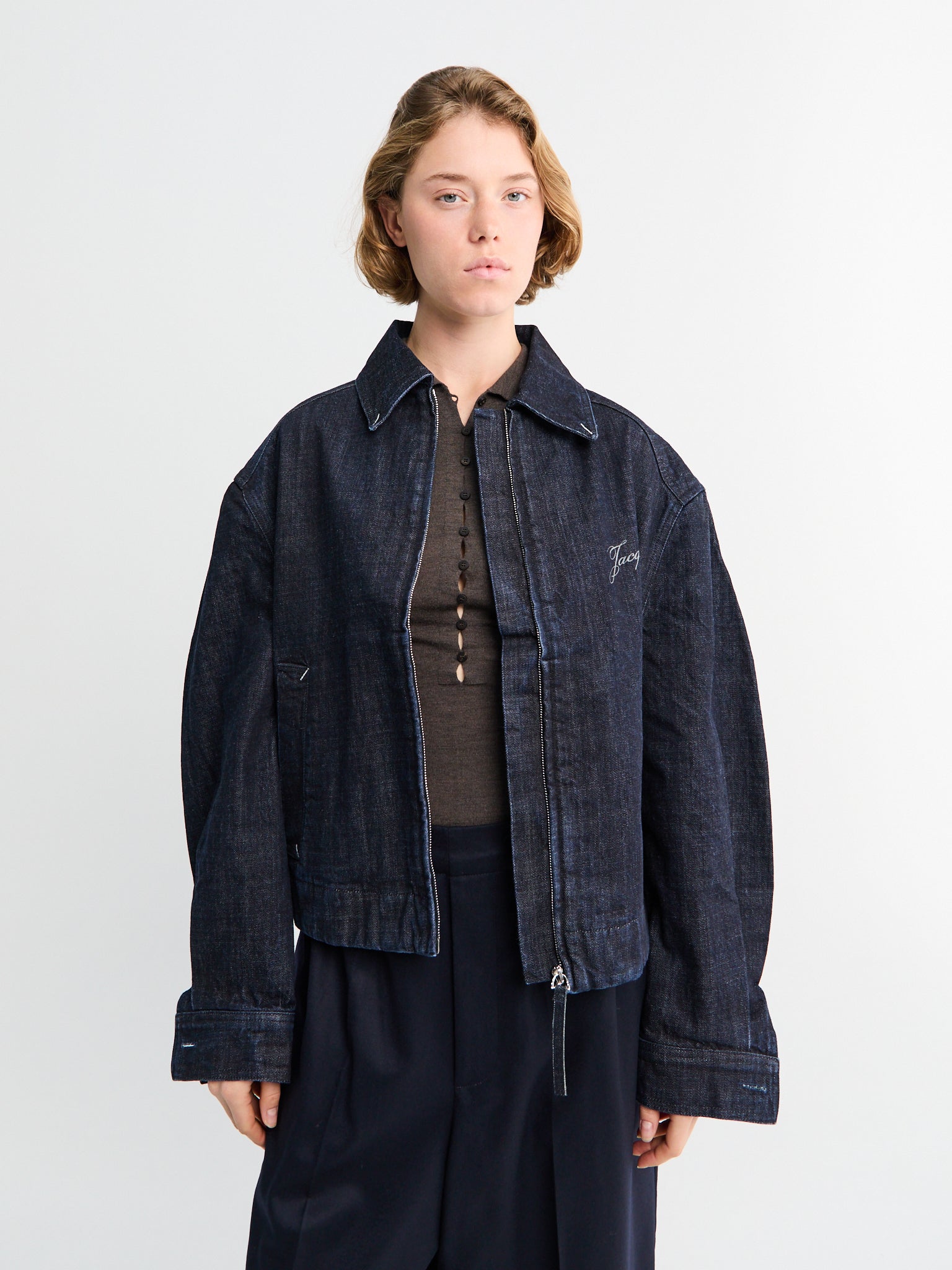 La Veste De-Nimes Canevas in Dark Navy by Jacquemus features a boxy fit made from a comfortable cotton blend. It includes a shirt collar, zip closure, and laser-printed logo on the chest for subtle branding. White stitched details, buttoned cuffs, and side pockets add practical touches