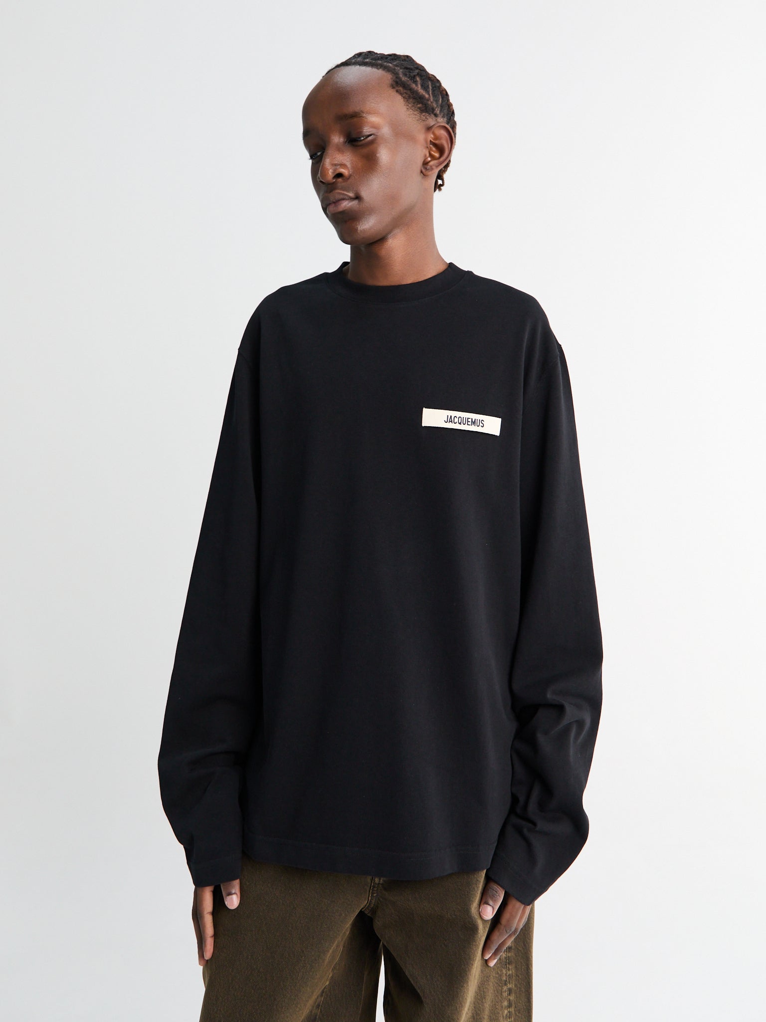 Long-sleeved crewneck t-shirt featuring a striking logo emblem across the front.