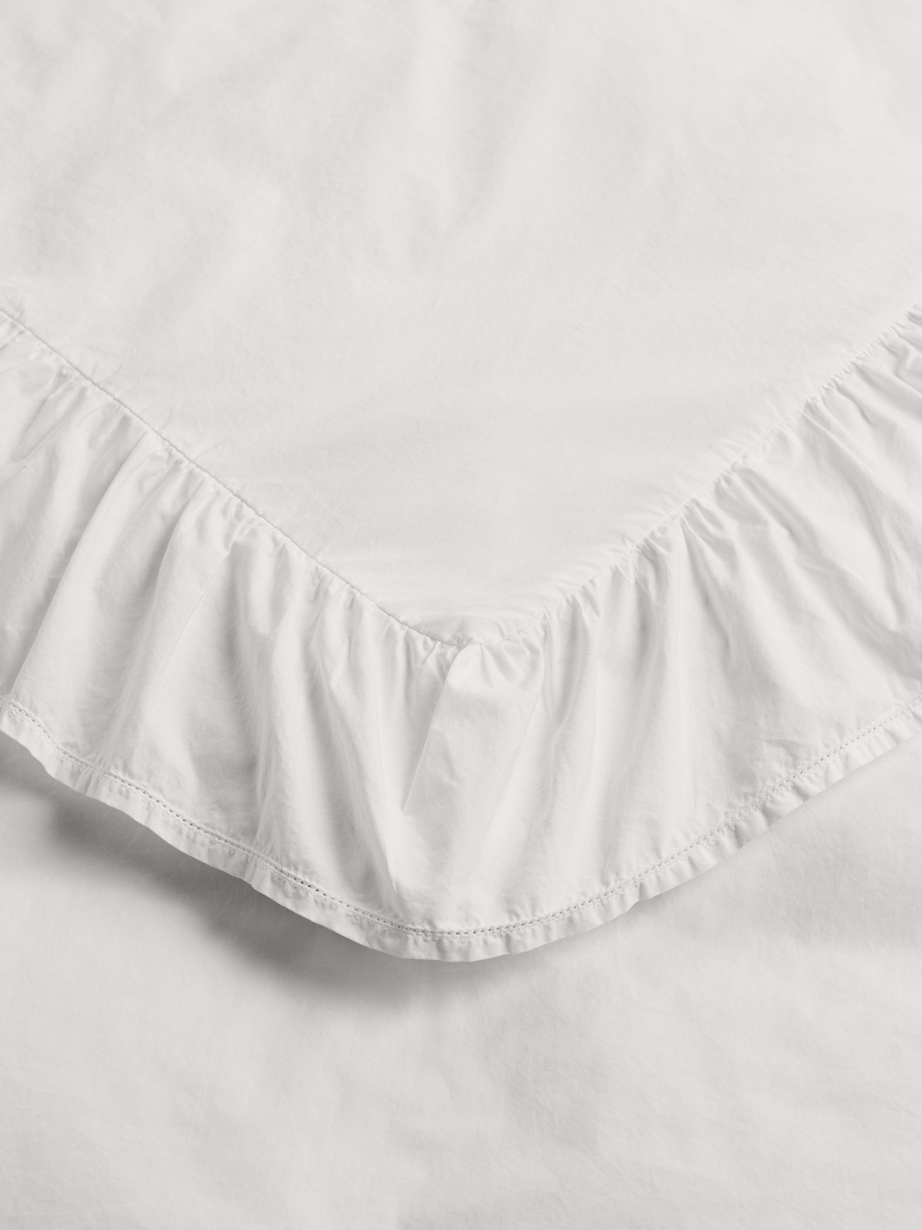 Lightweight percale weave double duvet cover crafted from stonewashed organic cotton. The breathable fabric offers a crisp, cool feel ideal for year-round comfort. Features delicate broderie anglaise detailing in a timeless broken white and elodie colorway