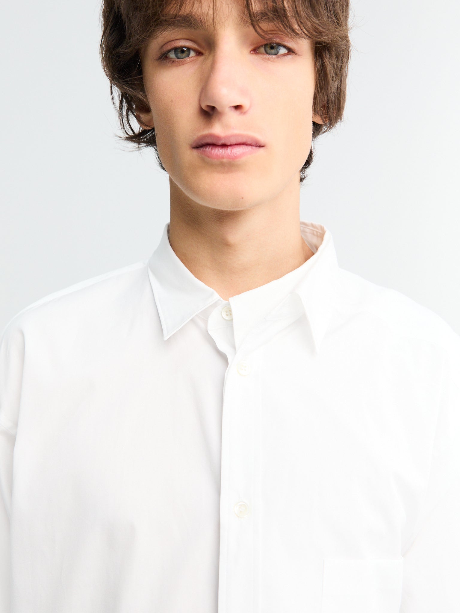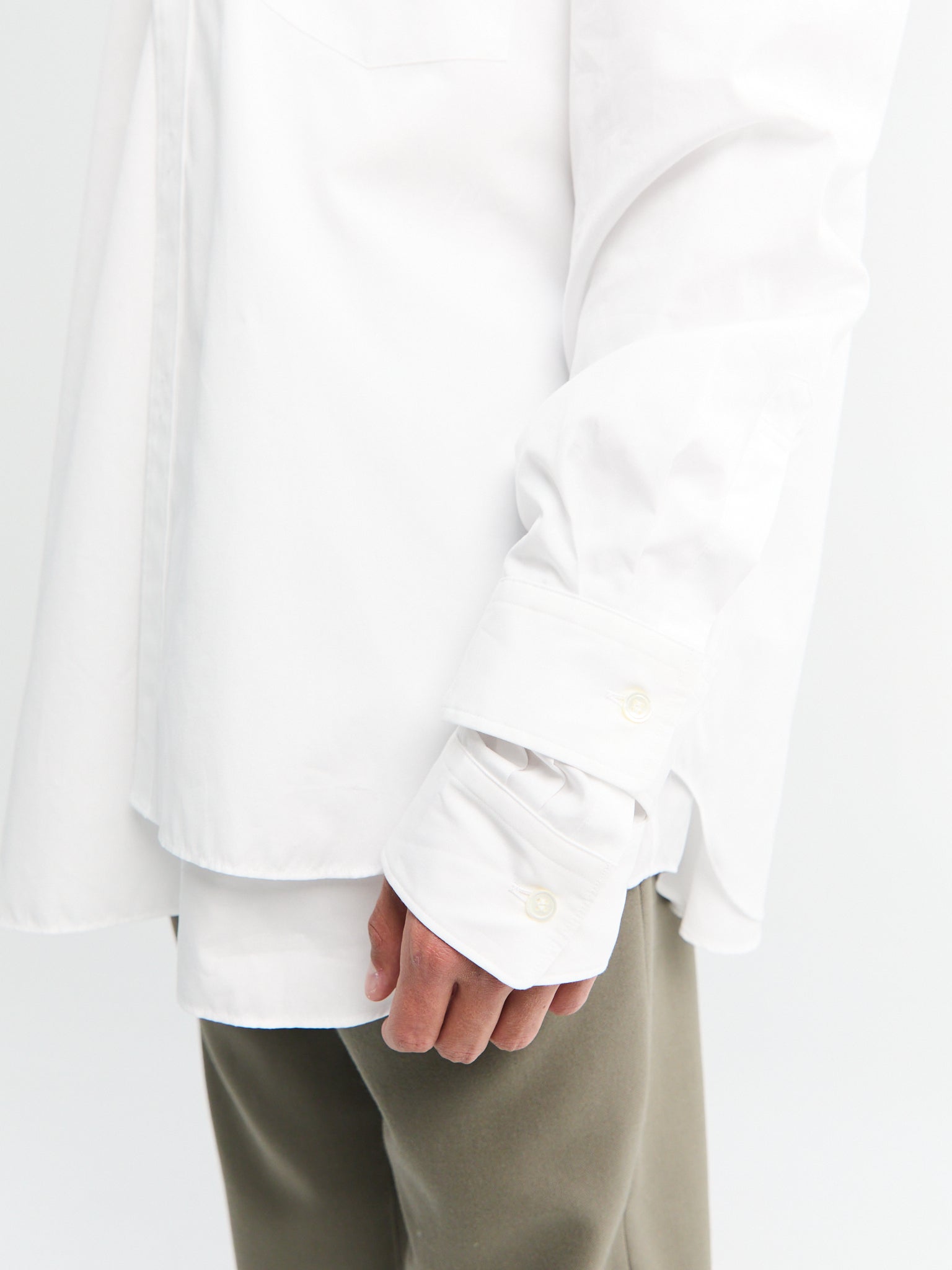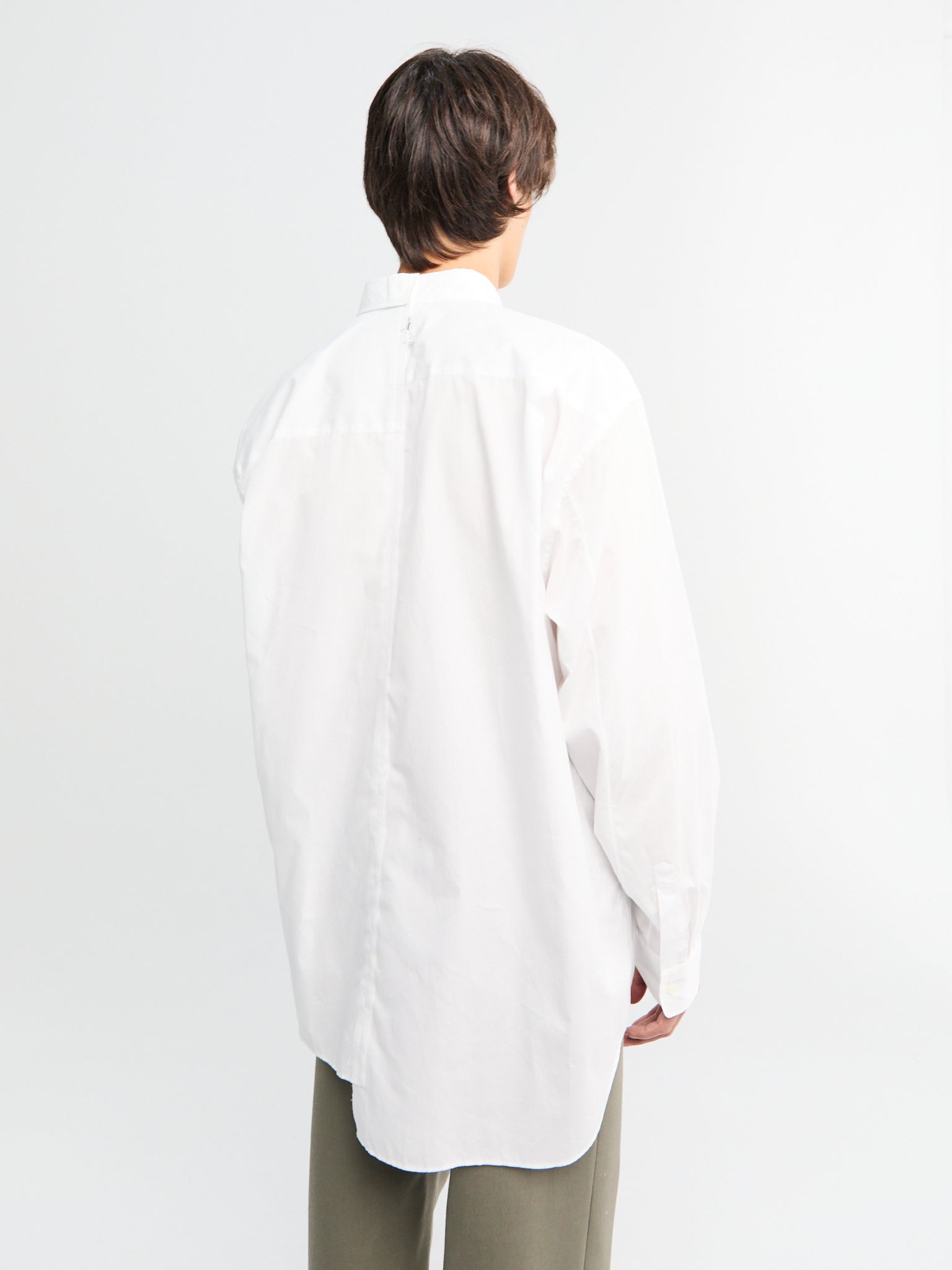 Designed as a deconstructed white shirt featuring asymmetric details, complete with a traditional collar, button-front fastening, and buttoned cuffs.