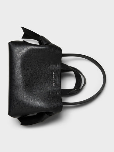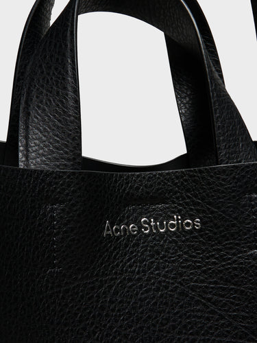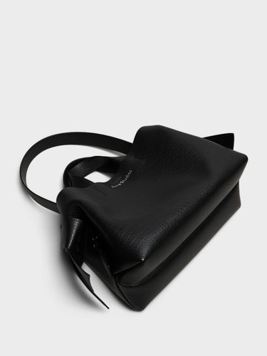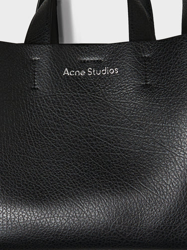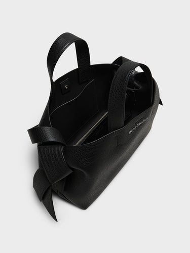 The Acne Studios Musubi Midi Tote Bag is crafted from textured black leather and detailed with signature twisted knots on each side, inspired by Japanese obi sashes. It features short top handles, a practical shoulder strap, an inner zip pocket, and a snap button closure for easy access.