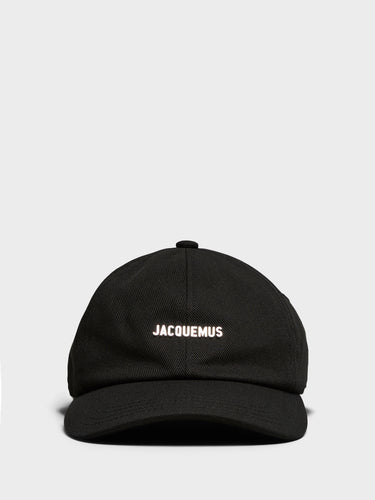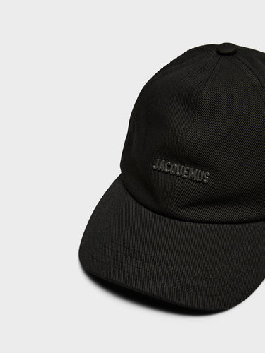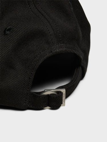 Black baseball cap with a silver-tone metal logo, and an adjustable strap at the back with a round square buckle.