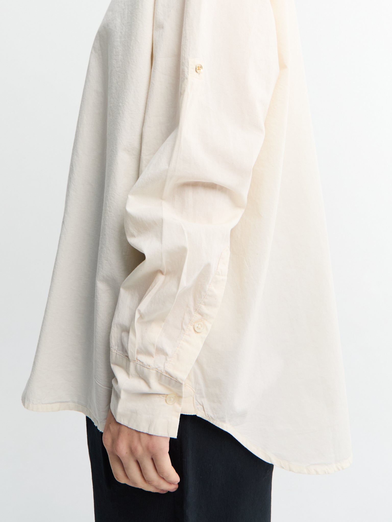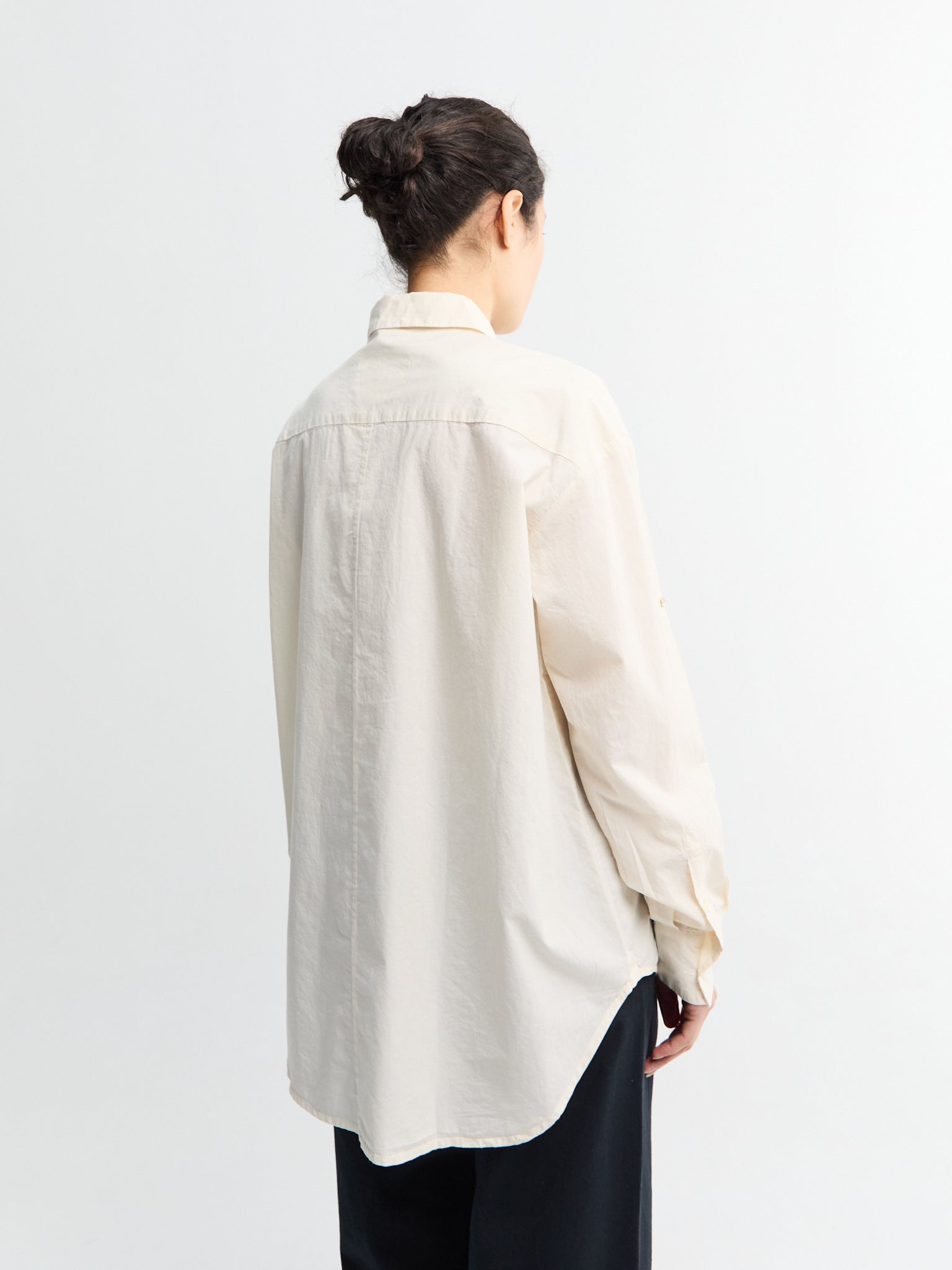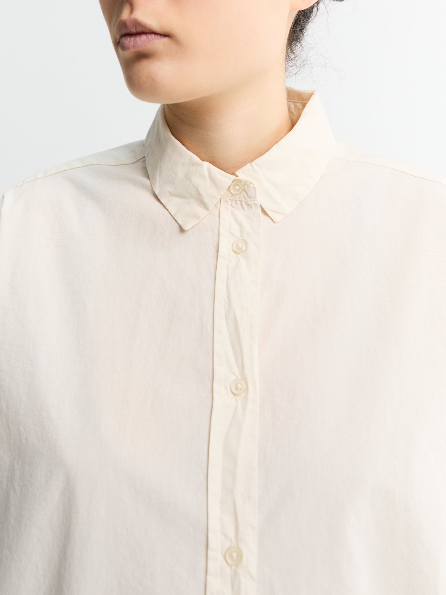 A versatile organic cotton shirt in soft ecru. Features a relaxed fit, classic collar, button front, and curved hem. Perfect for everyday wear.