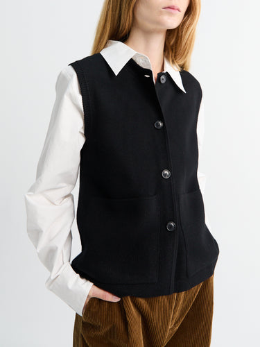 This Elva vest is made from high-quality merino wool. It features a boxy silhouette with patch pockets and knitted tubular trims around the button front and armholes.