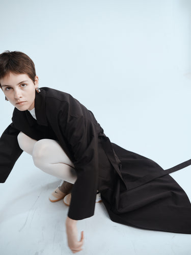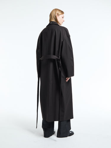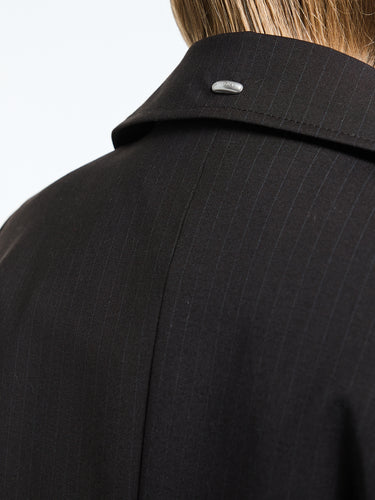 This Court Coat features a striped fabric, dropped shoulders, and a concealed button placket. It includes two welt pockets, is fully lined, and is designed with a wrap-around style and a waist belt for adjustability. The coat offers an oversized fit for added comfort.