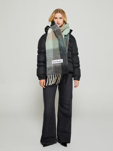 Acne Studios wool scarf made of a soft mohair blend with fringed ends, detailed with an embroidered logo.