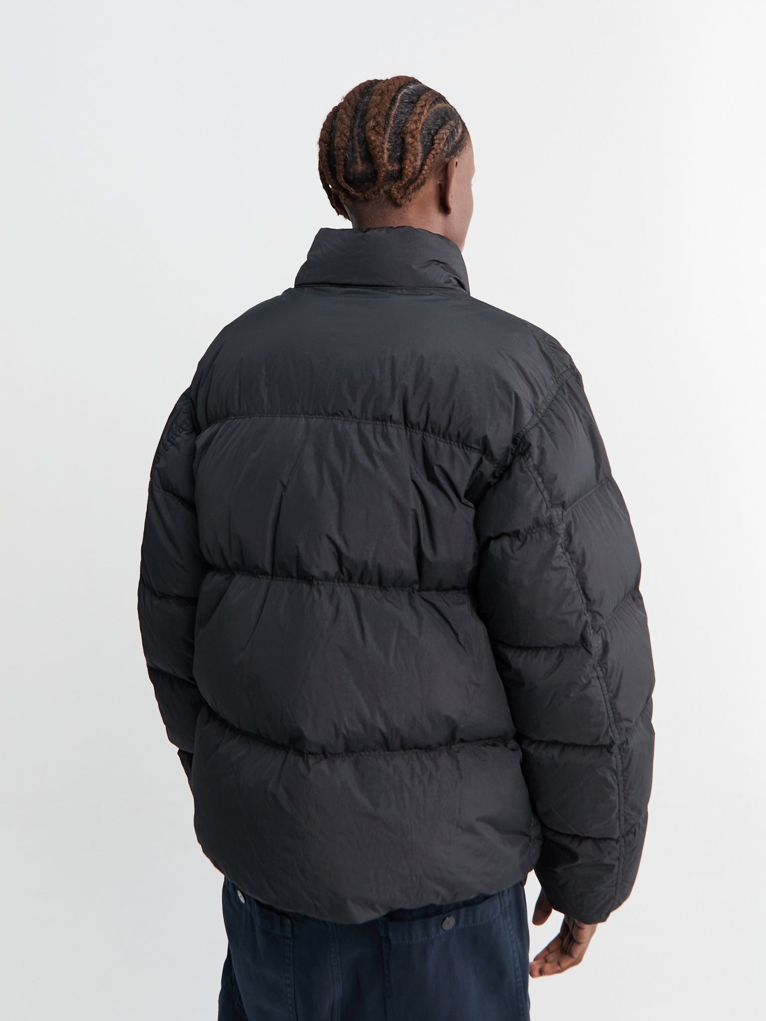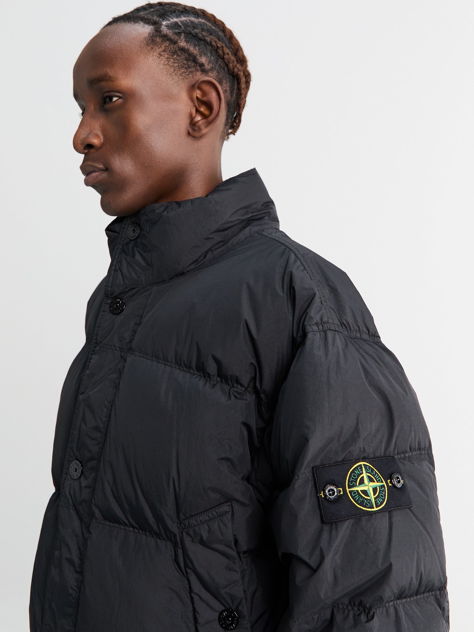 Down Jacket from Stone Island with a stand-up collar, two front pockets, ellastic cuffs and hem, featuring a button closure with hidden zip.
