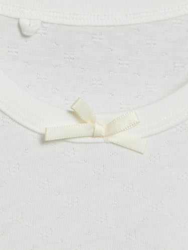 This classic t-shirt is made from a light pointelle-inspired mesh jersey, offering a delicate and detailed appearance. It features a decorative bow at the center front and ribbed edges at the neck and sleeves. The tight fit provides an elegant and feminine silhouette.