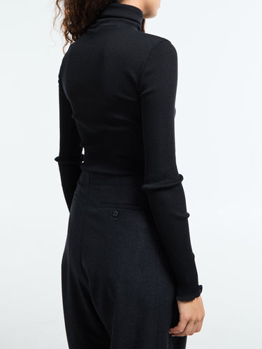 Wool & Silk Long Sleeve Rib Turtleneck Top in Black