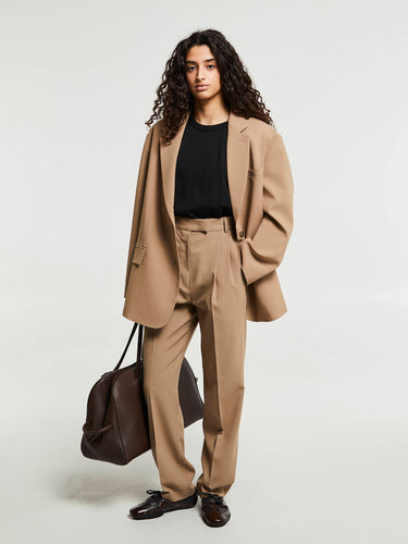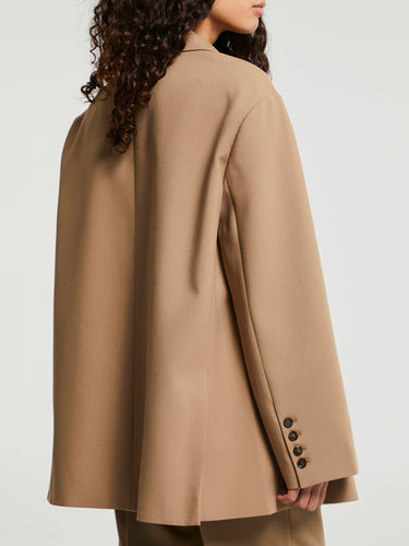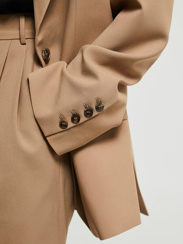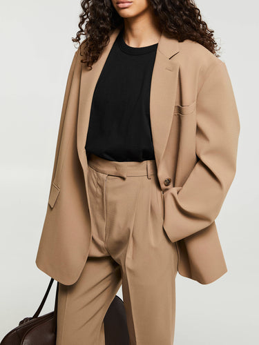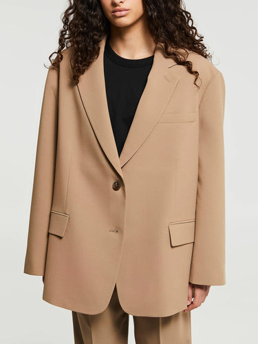 The Bea Blazer in Latte is made from a midweight suiting fabric with a slight stretch for comfort. It has an oversized, boxy fit with peak lapels and button cuffs. The blazer features flap pockets at the front, a welt pocket for added detail, and a vent at the back. It is completed with a button closure at the front and a satin lining.