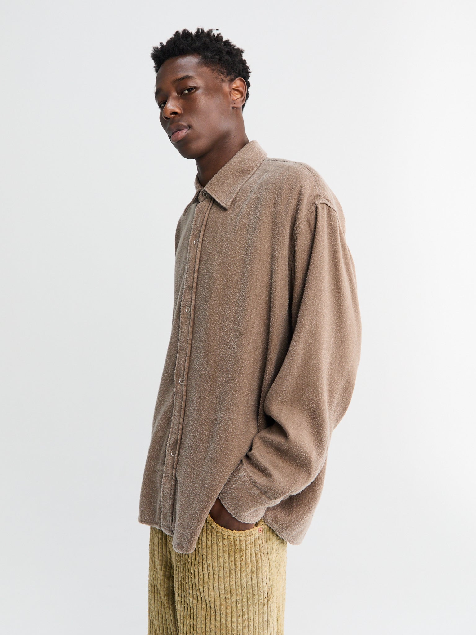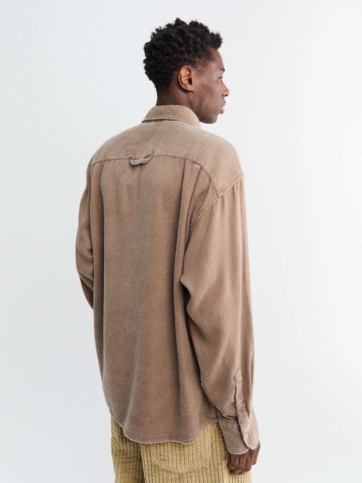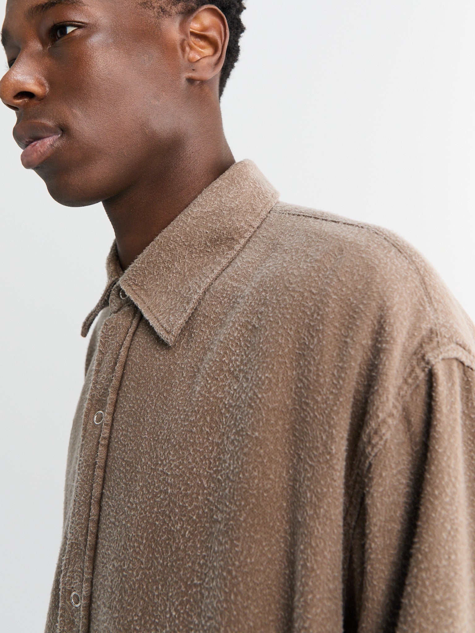 This shirt offers an oversized fit with dropped shoulders and a curved hem. It includes a spread collar and a snap button closure. Crafted from carefully selected natural materials, each style undergoes a treatment process that imparts a unique shade and distinct character.