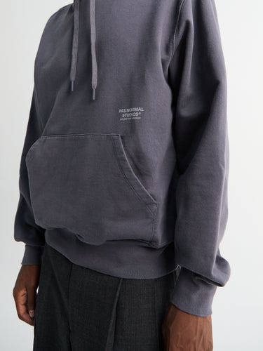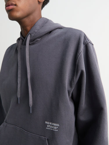 The Off-Race Hoodie in Steel is made from 100% organic cotton with a soft 370gsm terry back fabric. It features a kangaroo pocket, a secure side mesh pocket, adjustable cotton drawcords, and reflective logos on the front and back