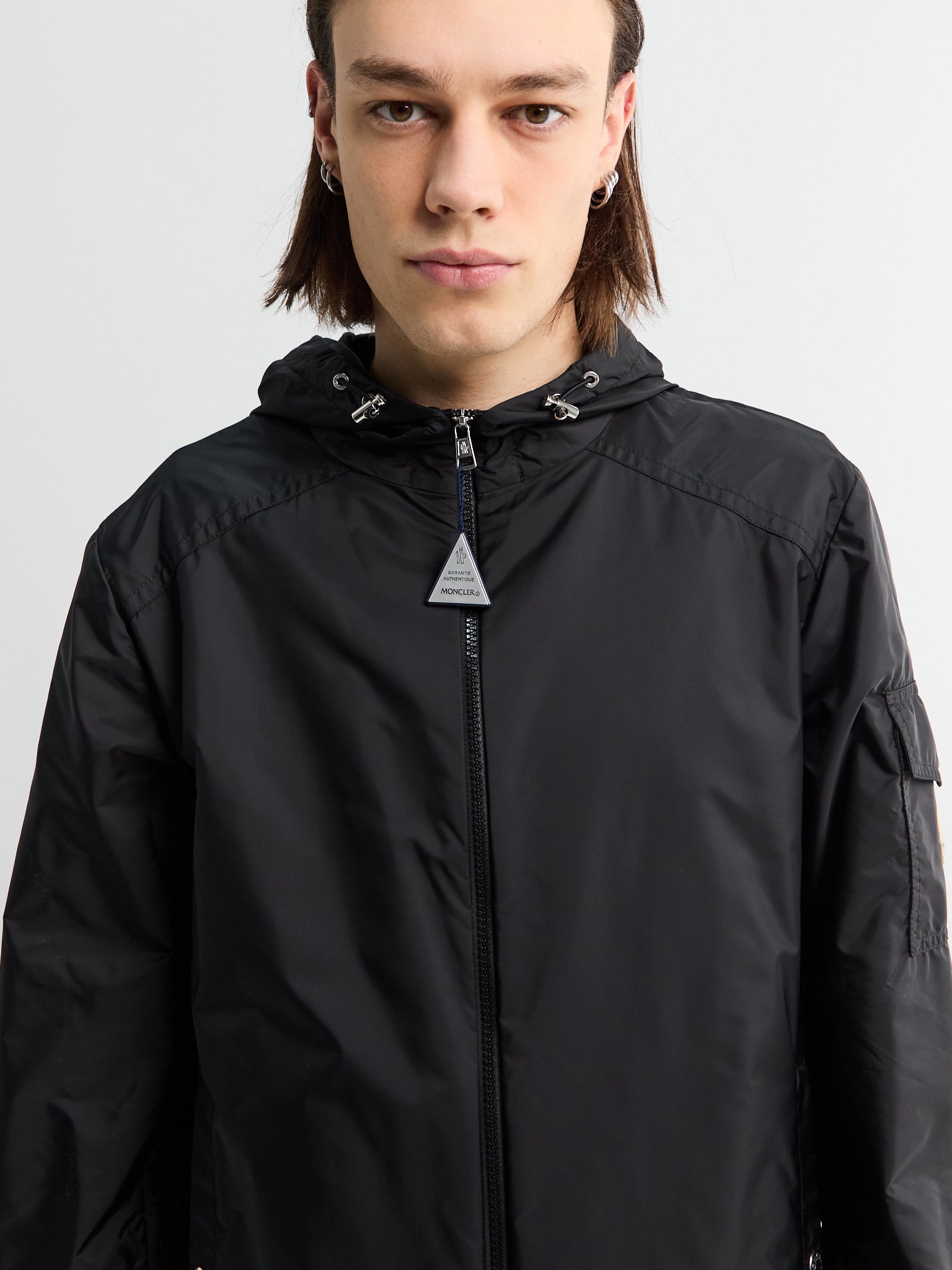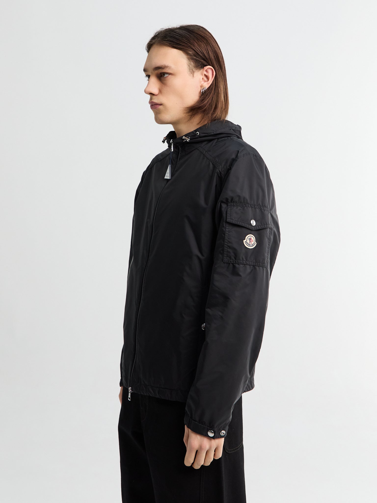 Water-repellent hooded rain jacket designed to keep you dry in wet weather. Features a full zip closure, adjustable cuffs, and drawstring hem for a secure fit. Practical pockets include zipped side pockets and a snap-button sleeve pocket for convenient storage.