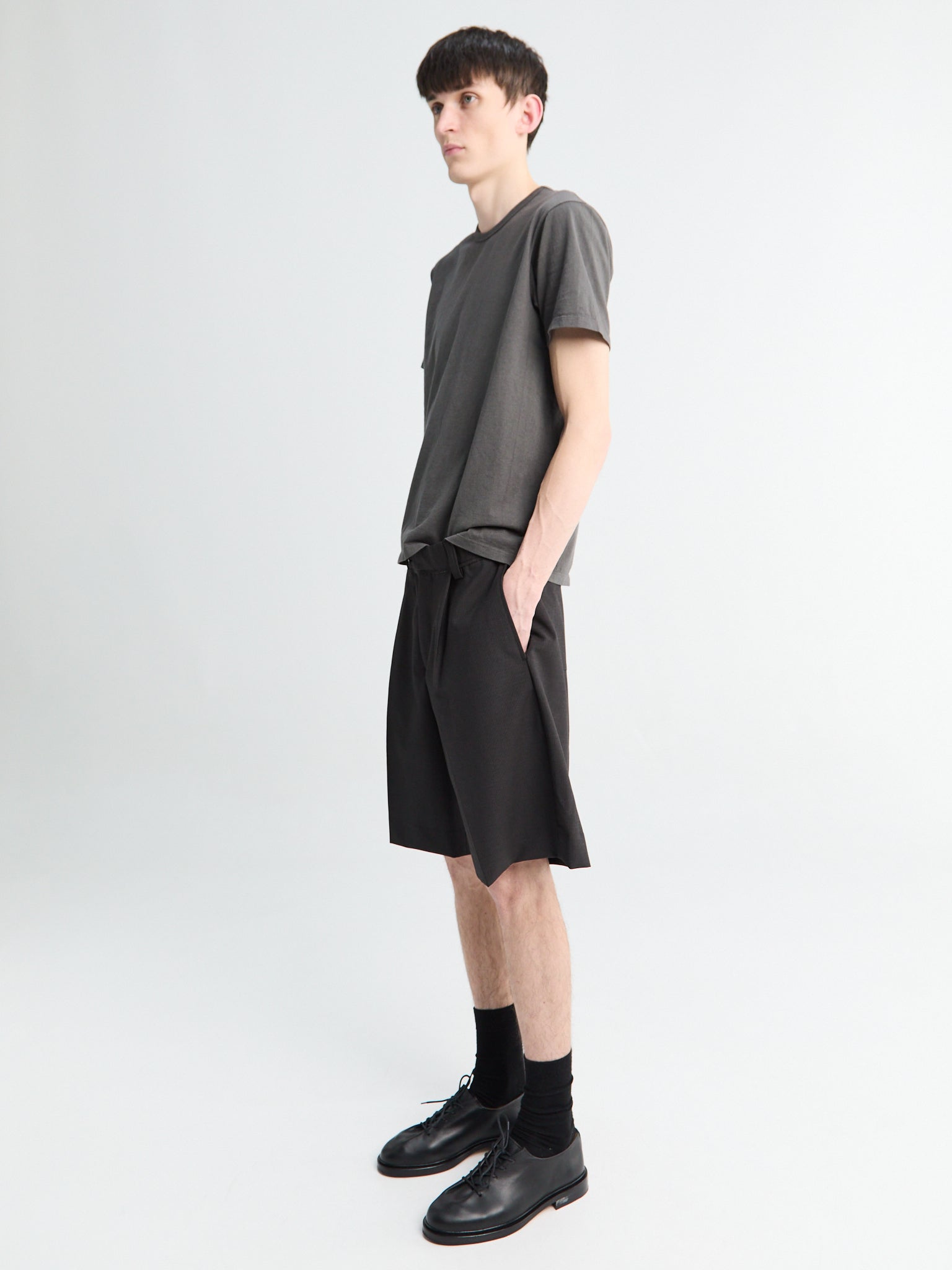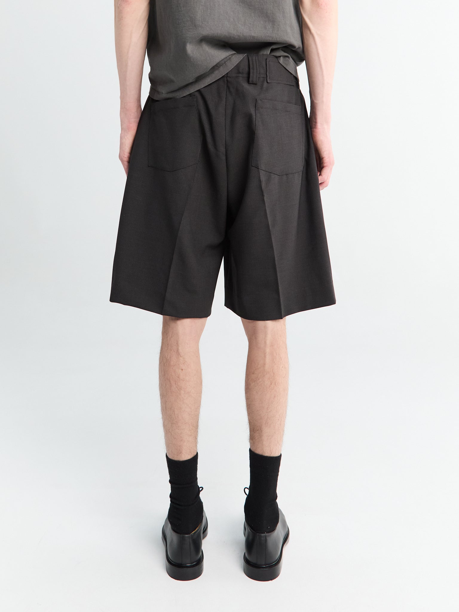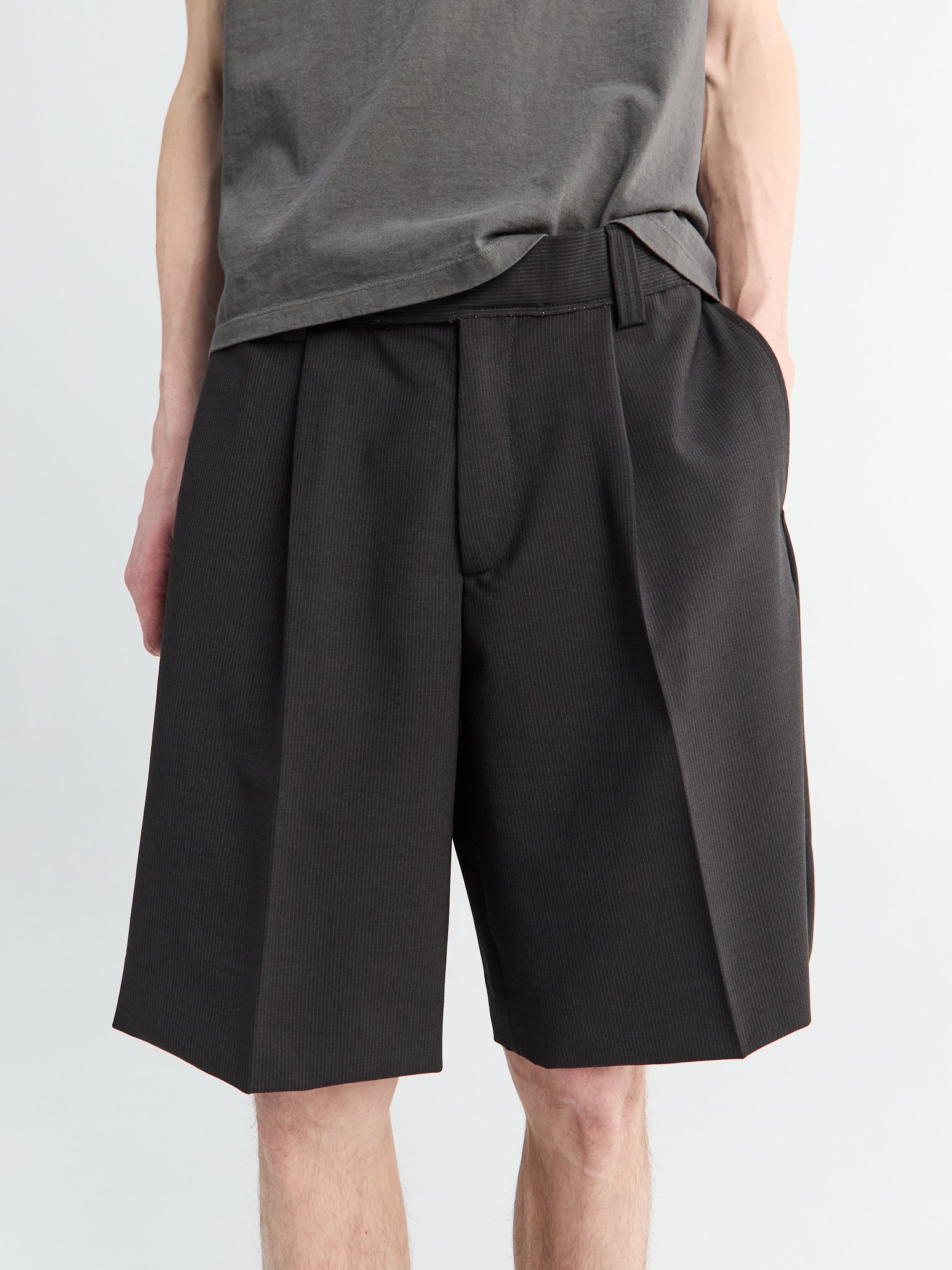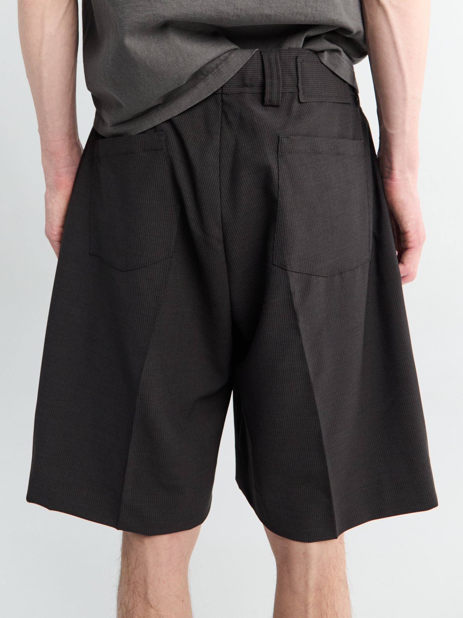 The Classic Shorts from mfpen are crafted in a dark grey stripe fabric. Cut for a relaxed, wide-leg fit, the design is structured with front pleats and a belted waistband.