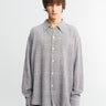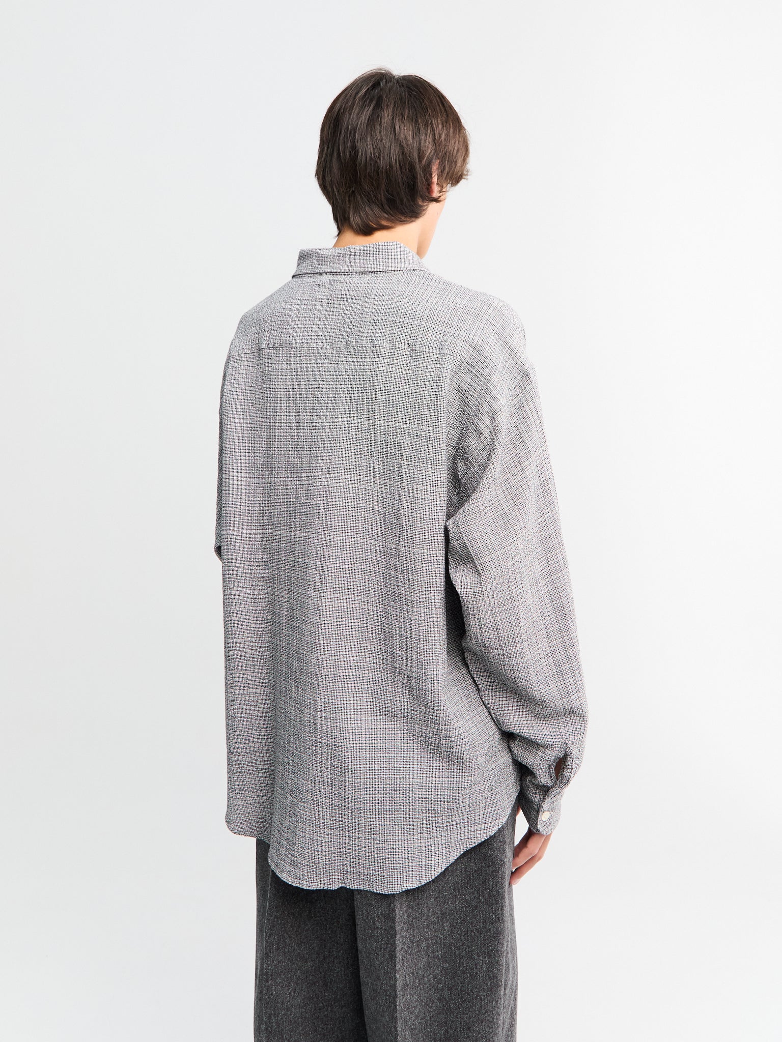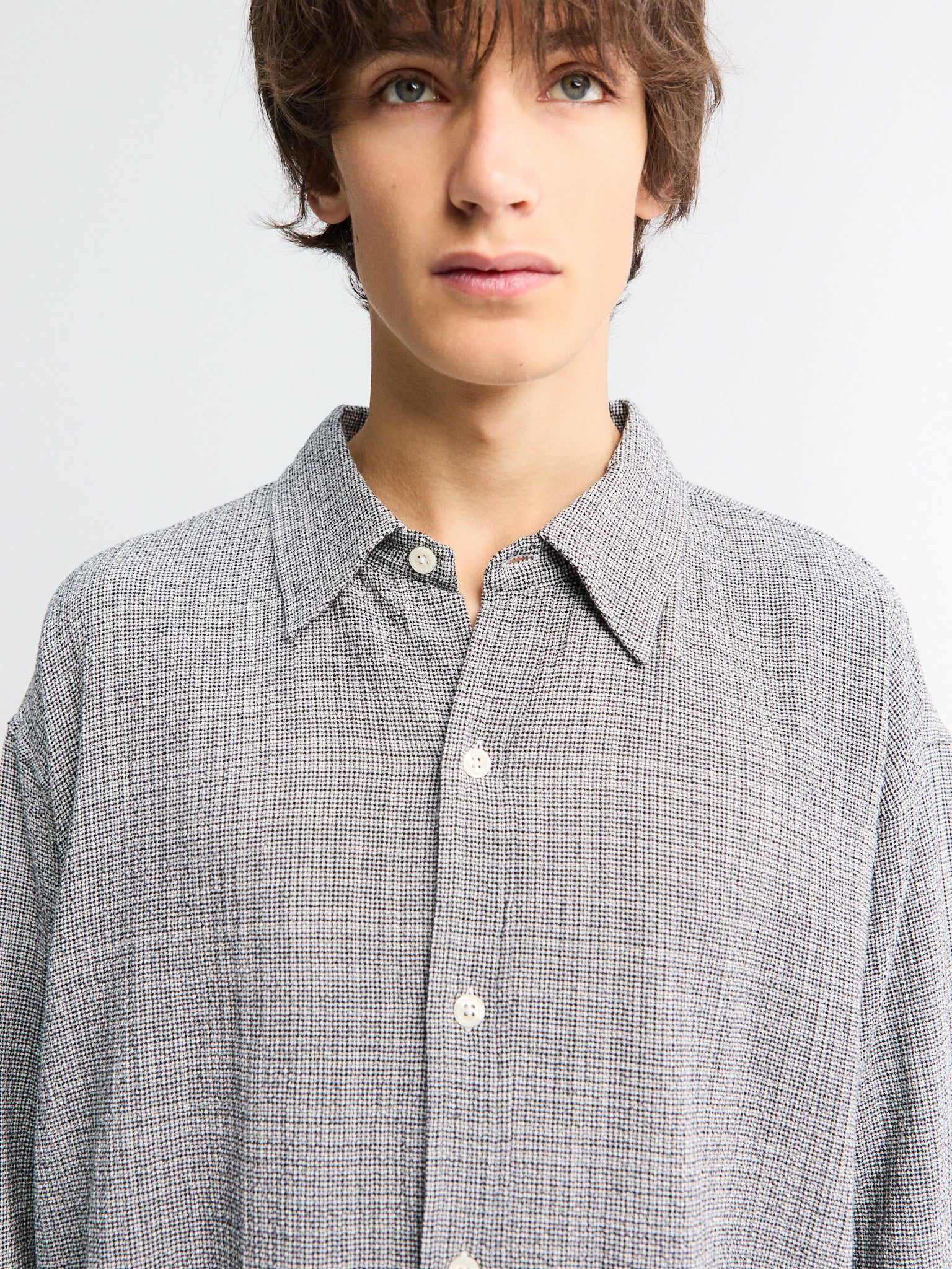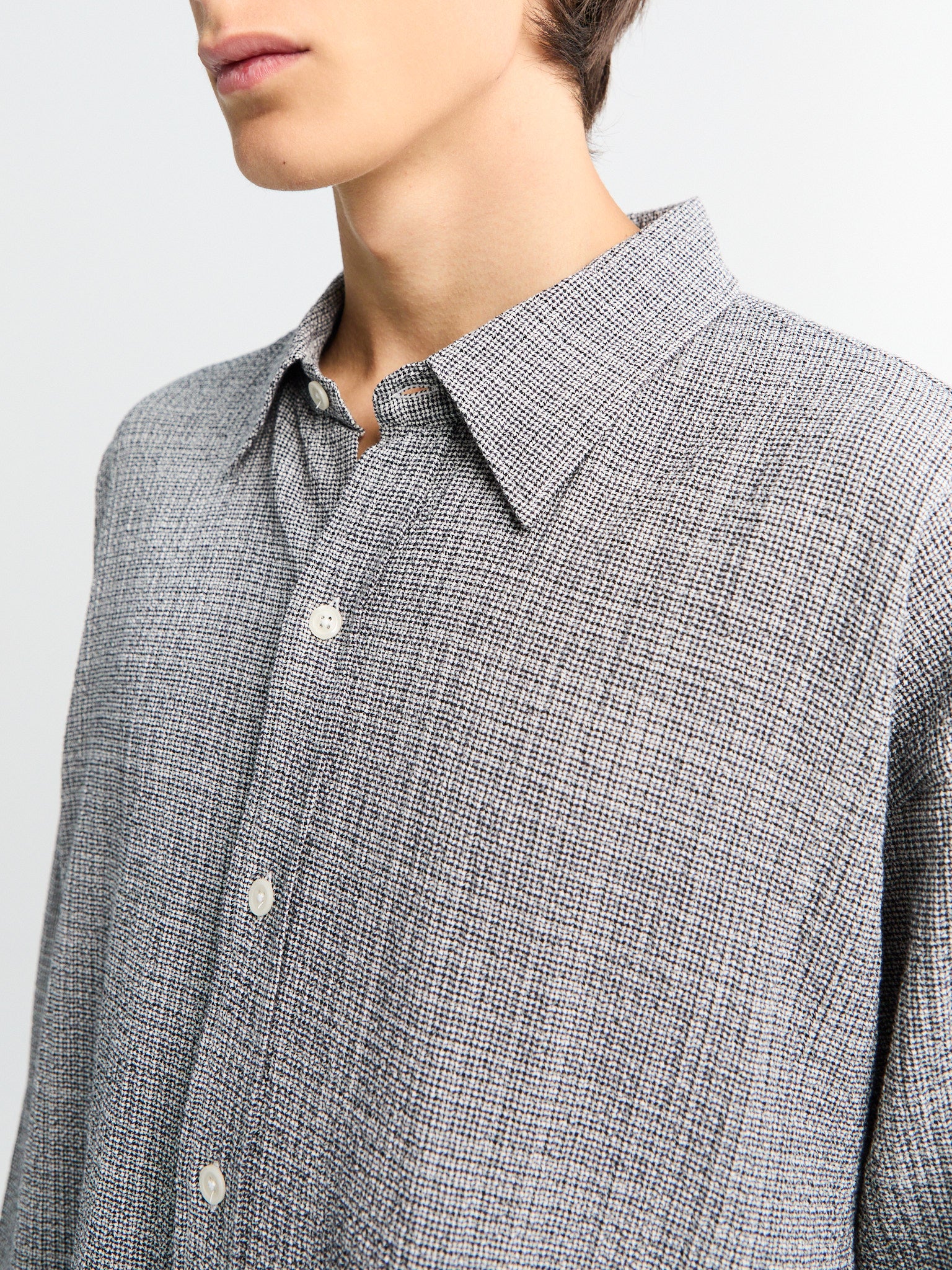 The Vacation Shirt has a loose boxy fit with drop shoulders and a curved hem. The shirt is Cut from a lightweight seersucker cotton blend in a black mini houndstooth check on a white ground.
