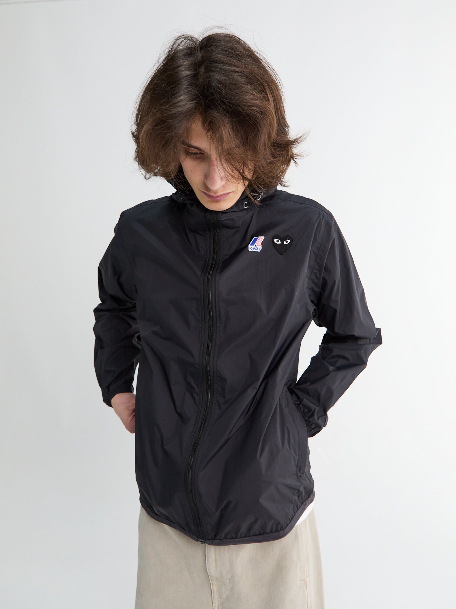 The Comme des Garçons Play x K-Way Full Zip Packable Jacket combines elements from both brands. Made from lightweight nylon ripstop, it features a full-length zip and an adjustable hood. The jacket is water-resistant and includes embroidered and printed branding, with both logos on the chest and an additional CDG Play heart detail on the back shoulder.