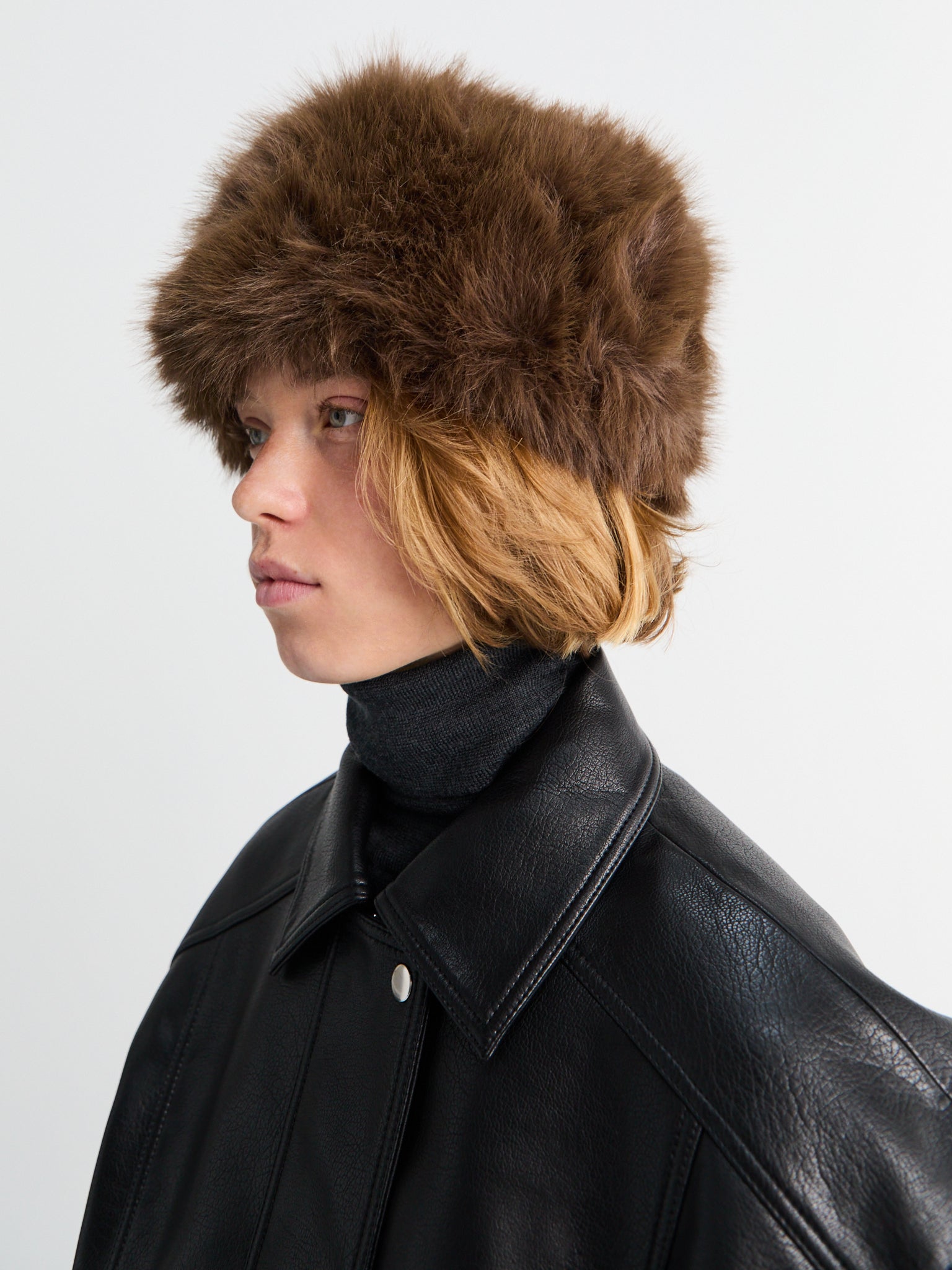 The Bansko Hat in Brown features a soft, plush faux fur exterior with a flat crown design. It includes a quilted lining for added comfort and is made entirely from 100% polyester.