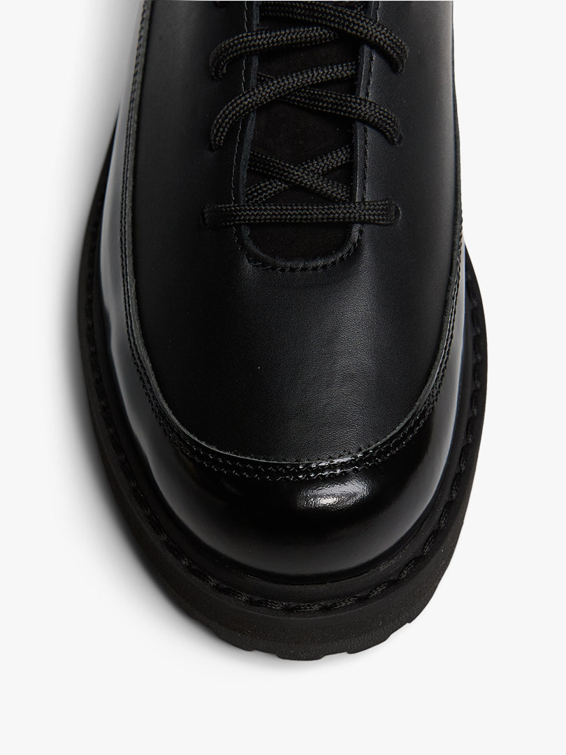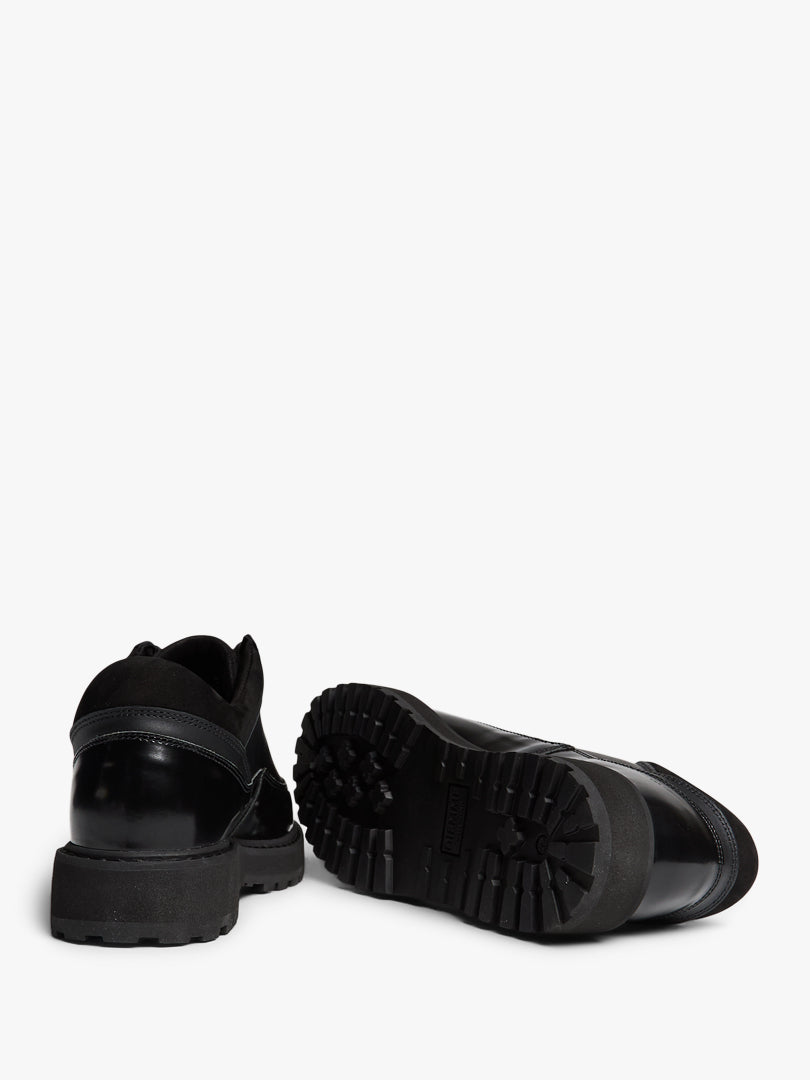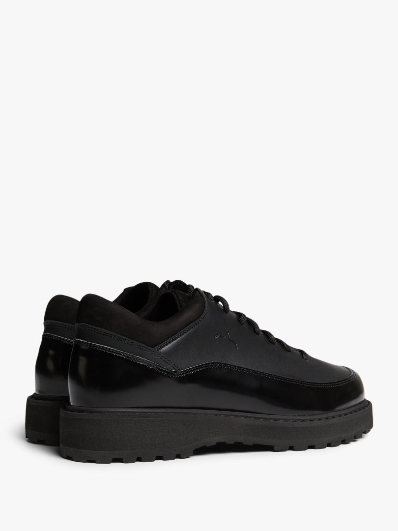 Crafted from black nubuck leather, the shoe offers a soft, textured upper that contrasts with a durable black rubber rand for added protection and structure. Set on a robust lugged sole, the silhouette delivers comfort, while the low-profile shape keeps the look sleek and versatile.