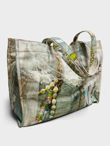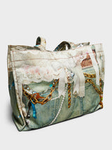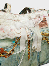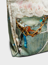 This tote bag is made from canvas cotton featuring an all-over denim print and highlighted by an embossed Acne Studios logo. It contains a small zippered pocket inside and is designed to be carried on the shoulder.