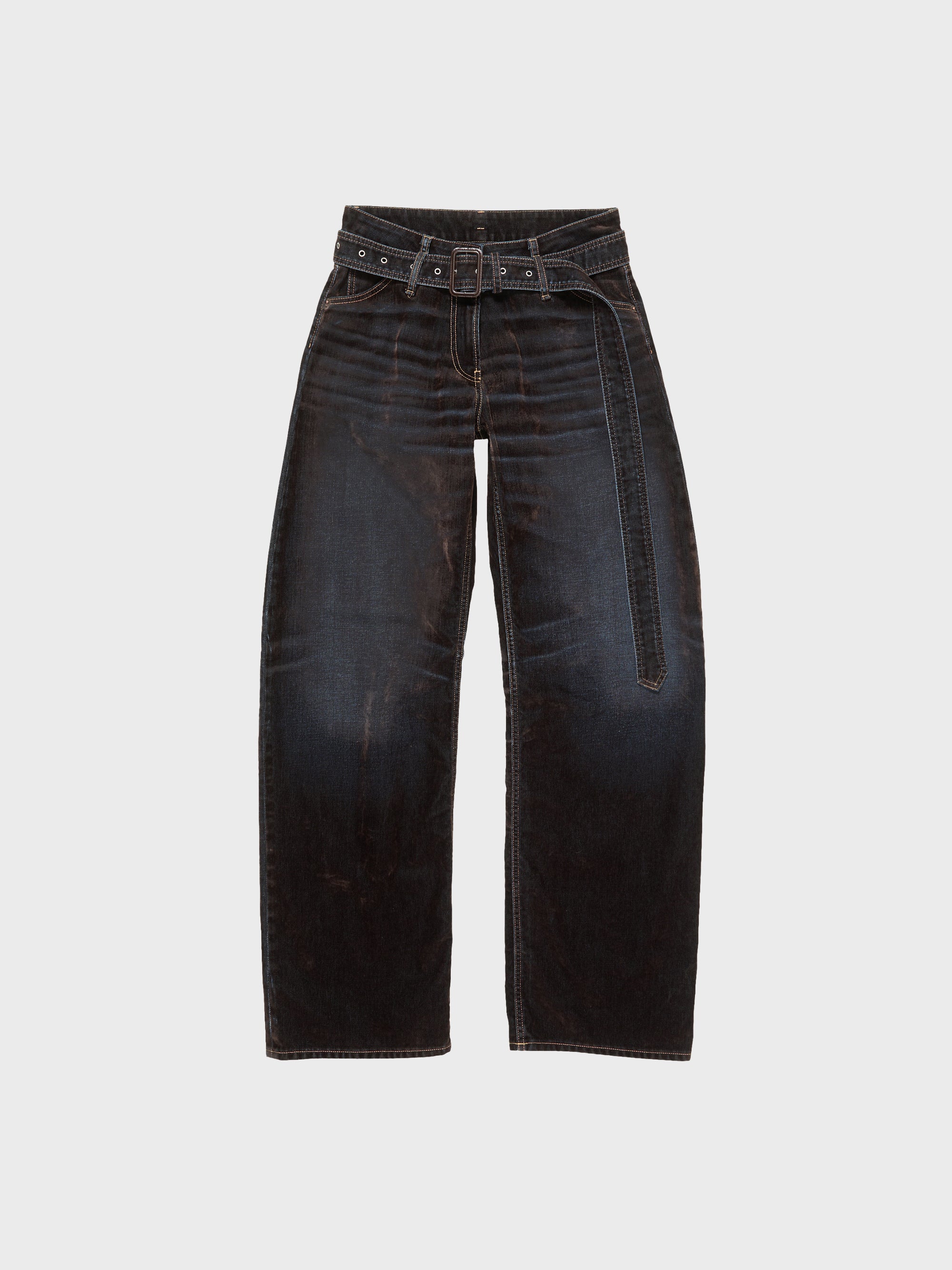 To the eye, the Trompe l'oeil Belted Jeans in Brown and Blue from Acne Studios appear worn, with fading and whiskers, but they actually feature a soft, velvety handfeel.