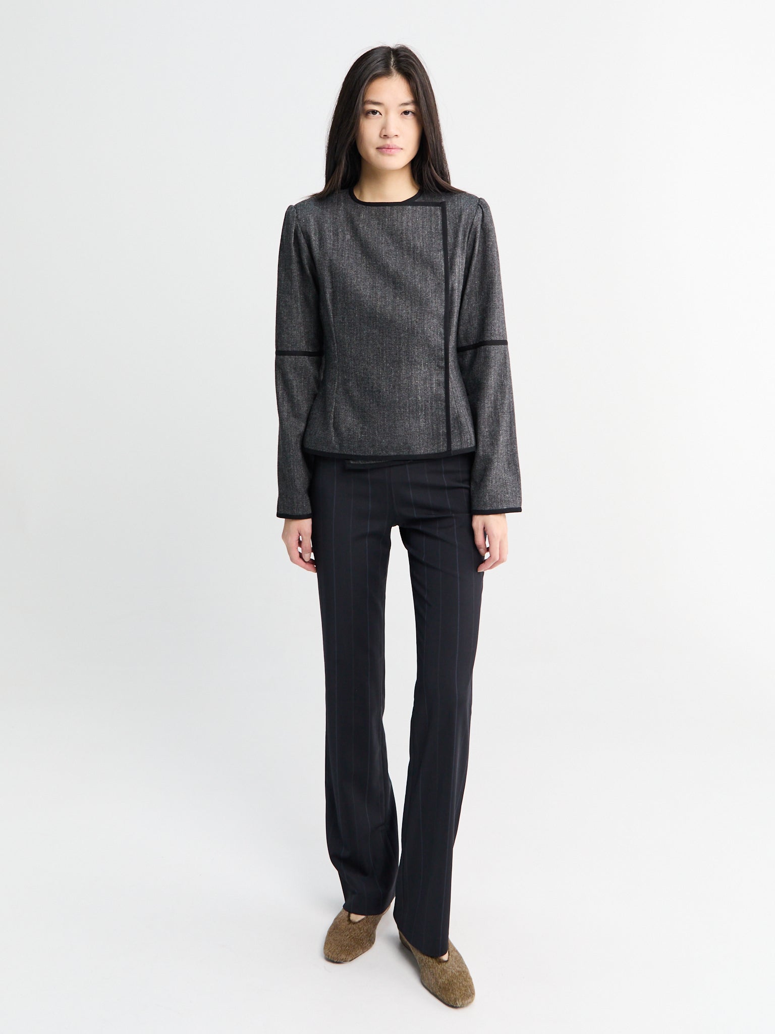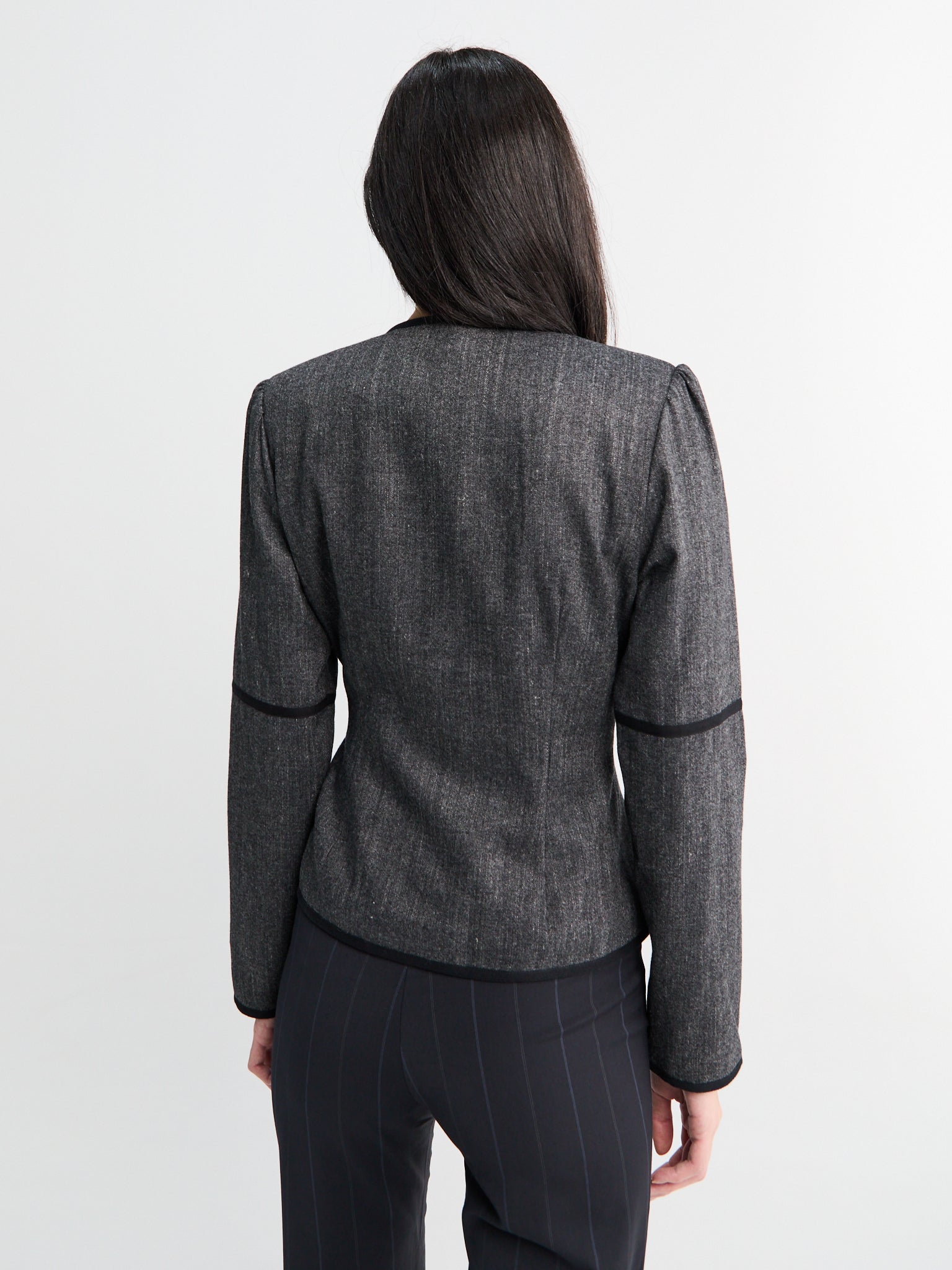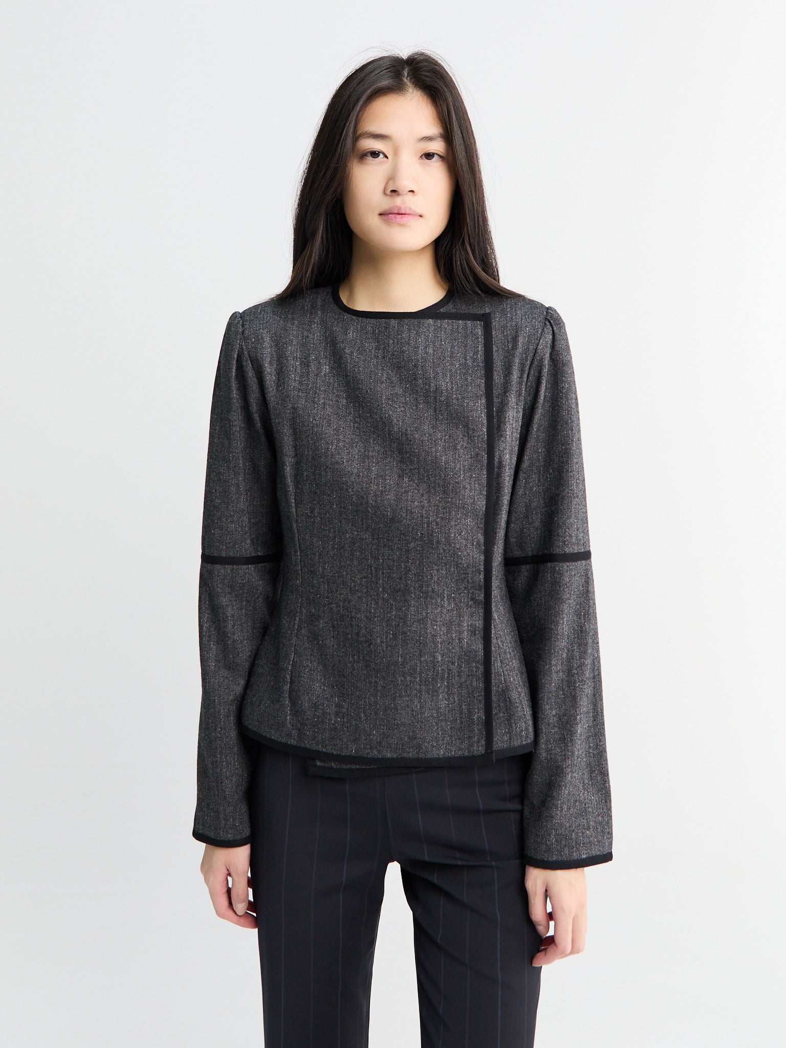 This tailored wool jacket features a distinctive crossover front with black binding along the edges and sleeves. The design showcases gently voluminous sleeves that taper above the elbow, creating an elegant silhouette. Fully lined for comfort and structure, this medium-weight piece offers a refined fit.