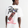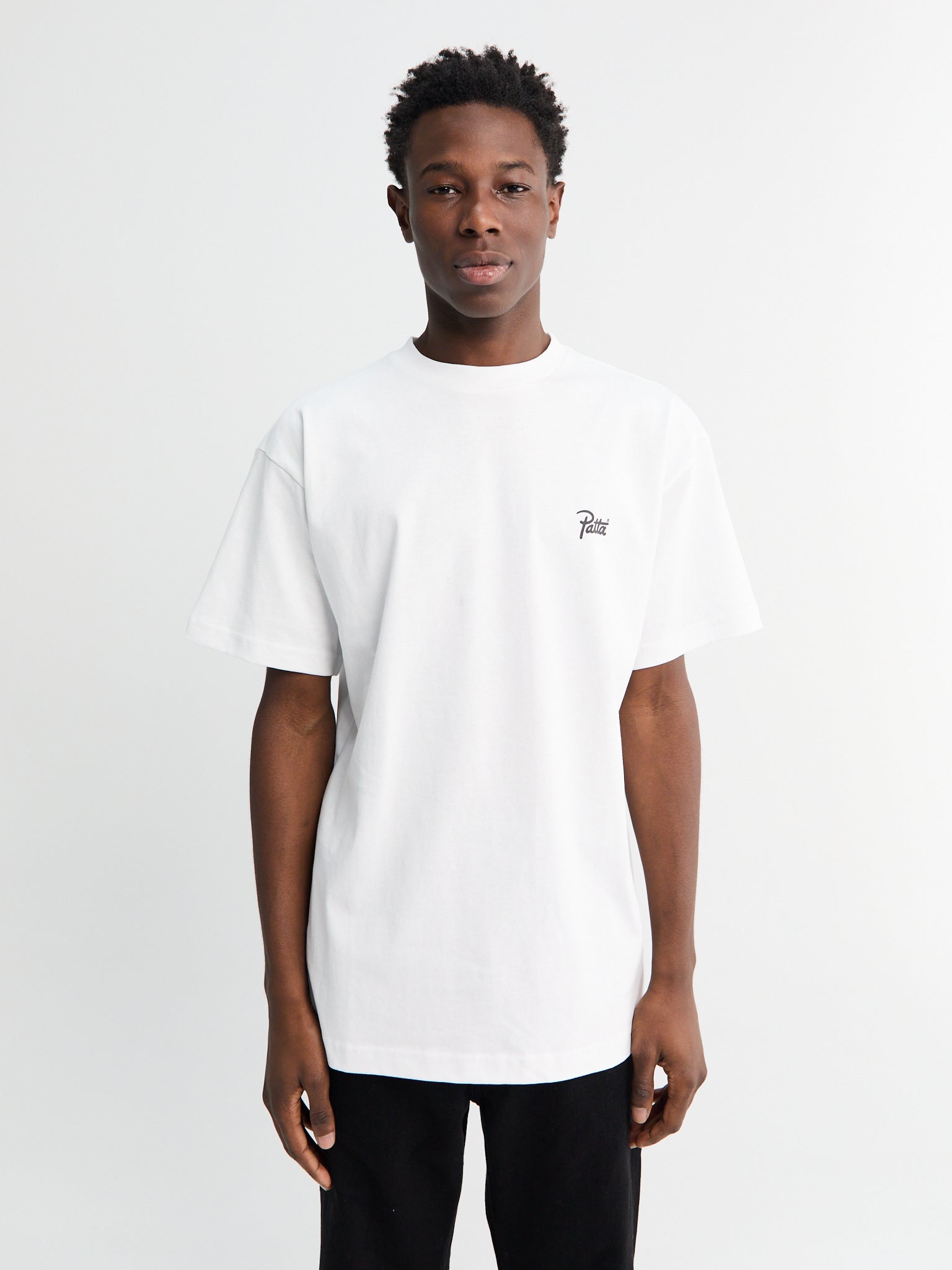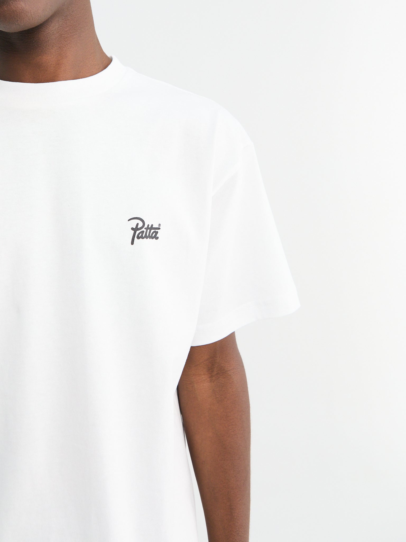 The Lighters T-Shirt in White features durable cotton for comfort and long-lasting wear. It offers a subtle Patta logo embroidered on the chest and a bold "Put your lighters up" graphic on the back
